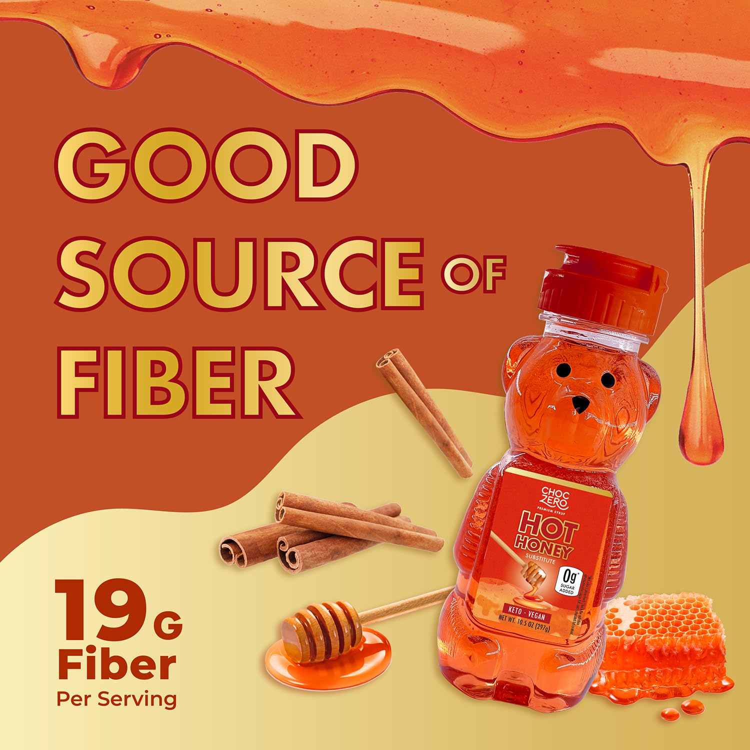 - Q: How much dietary fiber does ChocZero Cinnamon Hot Honey provide? A: Each serving of ChocZero Cinnamon Hot Honey is packed with 19g of dietary fiber, making it a great addition to your diet for digestive health and to help you feel fuller longer.