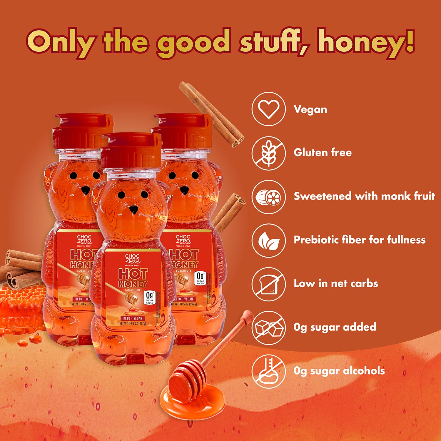 - Q: Is ChocZero Cinnamon Hot Honey suitable for a keto diet? A: Yes, ChocZero Cinnamon Hot Honey is keto-friendly, containing only 1g of net carbs per serving. This makes it an excellent choice for those following a low-carb or ketogenic lifestyle.