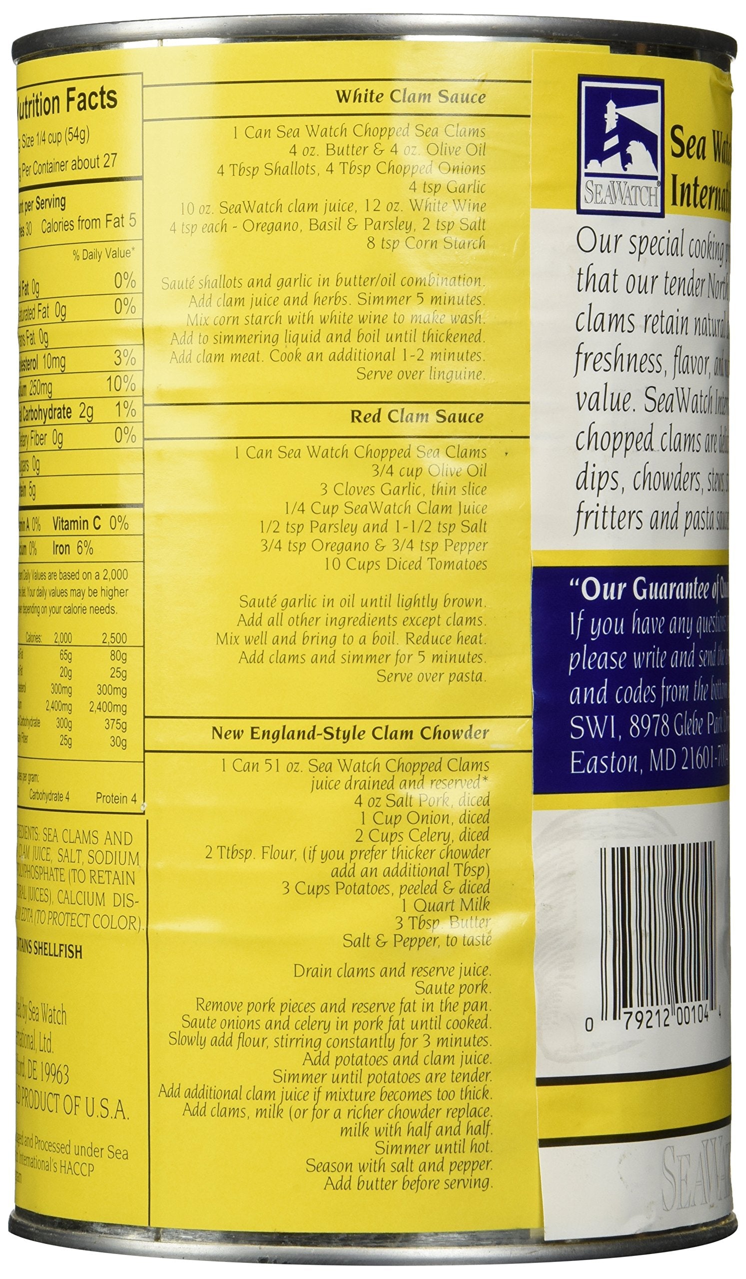 Q: What is the packaging size of the Chopped Sea Clams?A: The Chopped Sea Clams are available in a basic pack containing two 51-ounce containers, providing ample quantity for multiple meals or recipes.