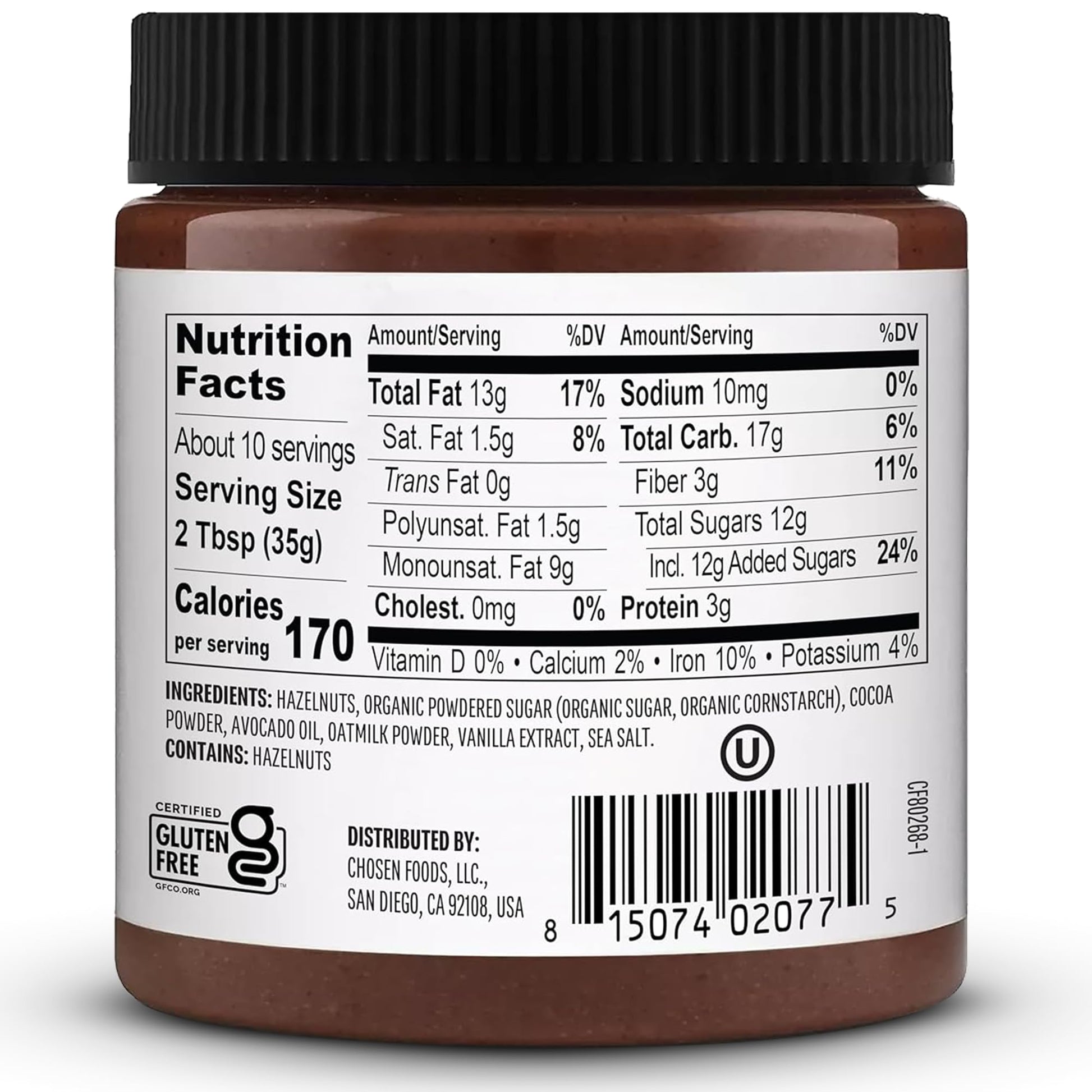 Introducing Chosen Foods Chocolate Hazelnut Spread - Our clean & simple take on this classic indulgent spread is made with 100% pure avocado oil & is 1000% delicious. Crafted with hazelnuts as the first ingredient, every spoonful bursts with irresistible richness. Weve swapped palm oil for 100% pure avocado oil, which is rich in good fats and boasts a neutral taste, delivering a deliciously creamy, smooth texture. With 40% less sugar than leading brands, you can savor the decadent chocolate hazelnut flavor without overwhelming sweetness. This delicious spread is vegan and free of palm oil. This silky chocolate hazelnut spread is made with simple ingredients - no need to sacrifice your values or dietary preferences. It is also kosher and certified Non-GMO, allowing for all ages to enjoy. Whether spread on toast, used as a dip, or savored straight from the jar, Chosen Foods Chocolate Hazelnut Spread offers pure, unadulterated joy in every bite. Embrace the chocolatey goodness and the redefined indulgence that puts simple ingredients and quality first.