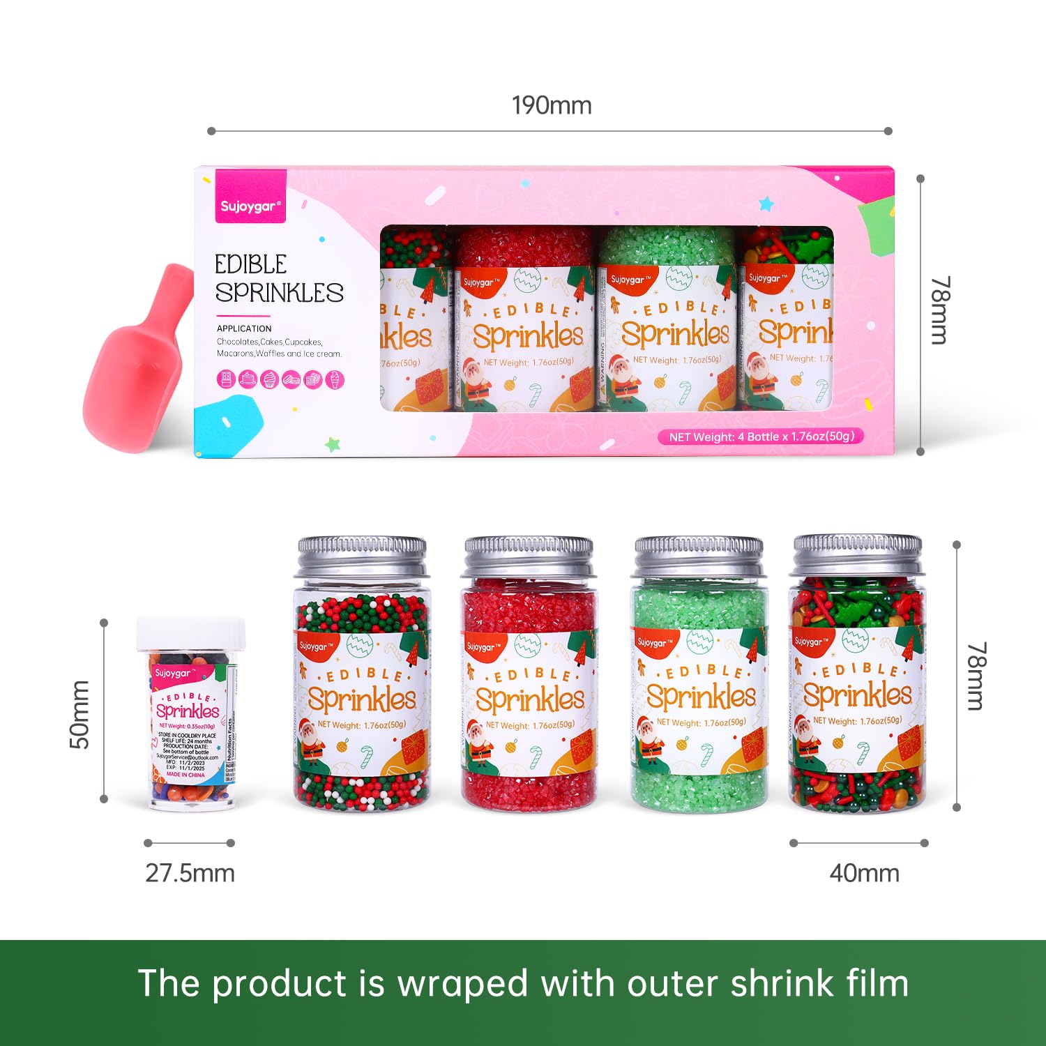 Q: What are the ingredients in the Christmas sprinkles?A: The Christmas sprinkles are made from food-grade ingredients that are nut-free, GMO-free, peanut-free, and soy-free, ensuring they meet food safety standards.