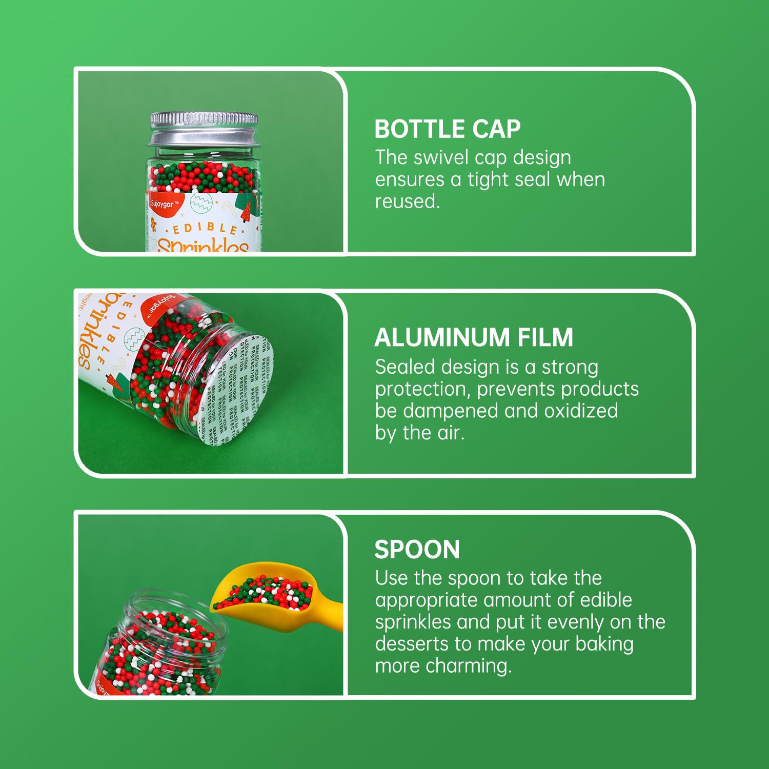 Sujoygar Christmas Sprinkles Set Include Christmas Sprinkles Mix, Red Green And White Nonpareils Sprinkles And Red Green Sanding Sugar Sprinkles. Ideal For Christmas Baking. The Delicious Sugar Sprinkles Can Make The Food More Christmas Holiday Festive. Food Grade Christmas Sprinkles Can Be Used In A Separate Bottle Or Mixed To Give You Endless Surprises. Take An Appropriate Amount Of Christmas Edible Sprinkles To Decorate The Cake, Cupcakes, Cookies, Chocolate, Ice Cream, Donuts And Desserts, Etc. It Is Recommended To Decorate The Food After Baking, Sprinkles At High Temperatures Will Melt To Varying Degrees.