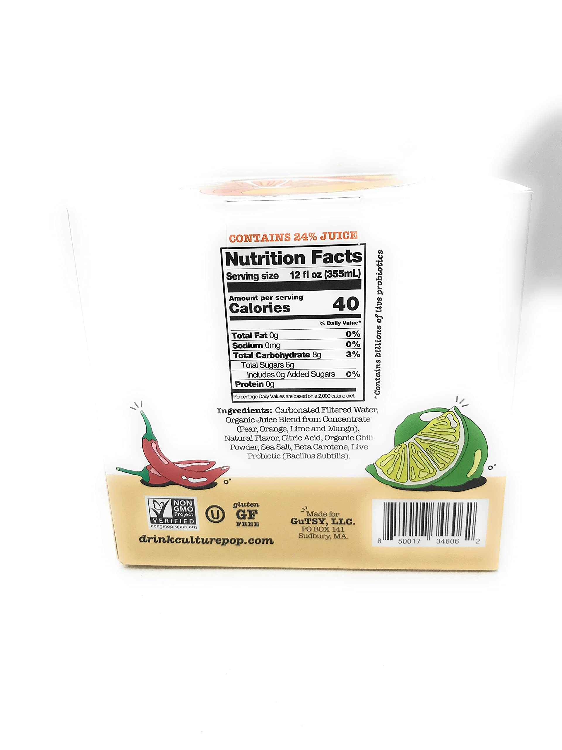 Q: What flavors are included in Culture Pop Soda Orange Mango & Lime?A: Culture Pop Soda Orange Mango & Lime features a refreshing blend of orange, mango, and lime flavors, making it a vibrant and fruity sparkling soda option.