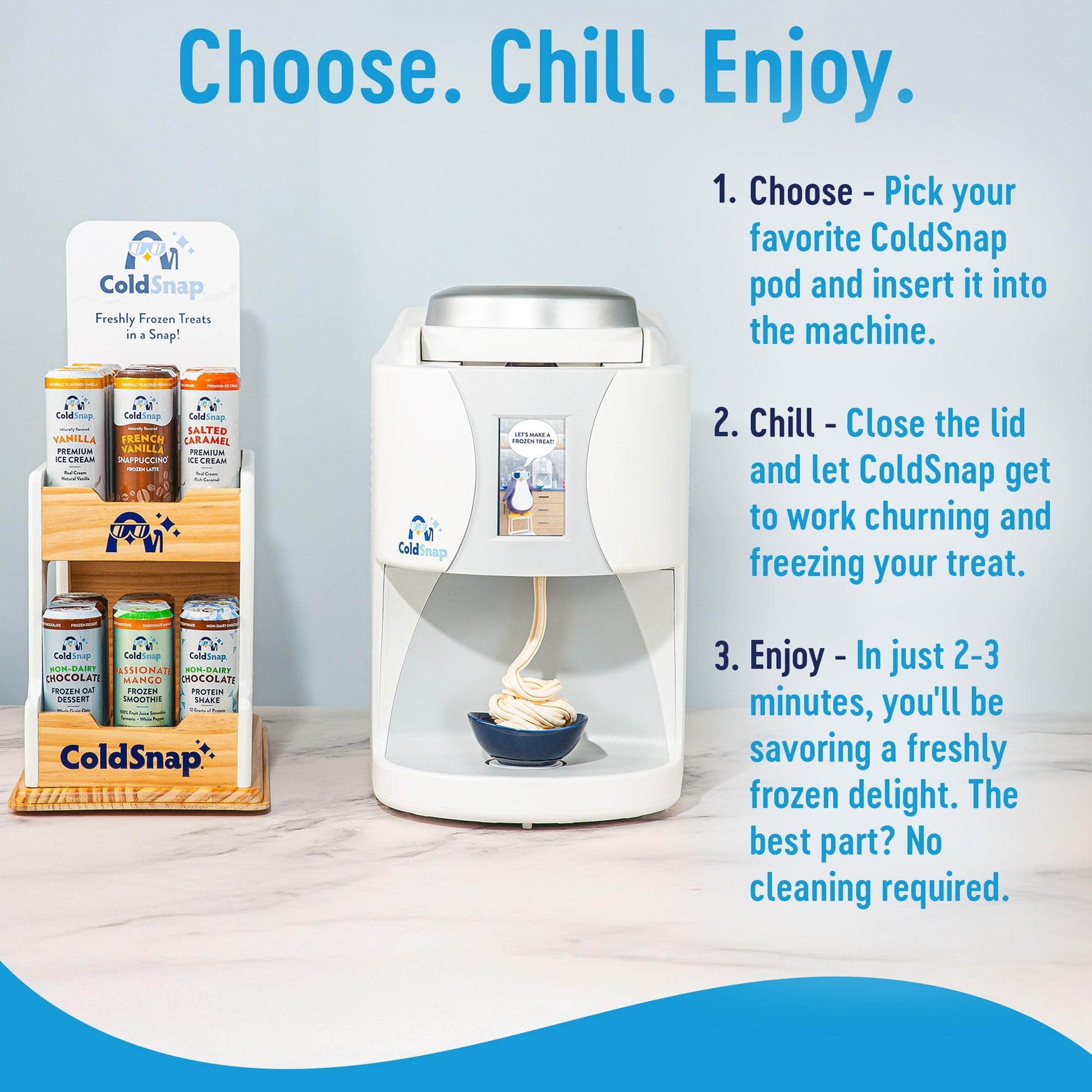 - Ready Anytime, Anywhere – ColdSnap’s shelf-stable pods require no freezer space and are always ready to deliver fresh, creamy ice cream.