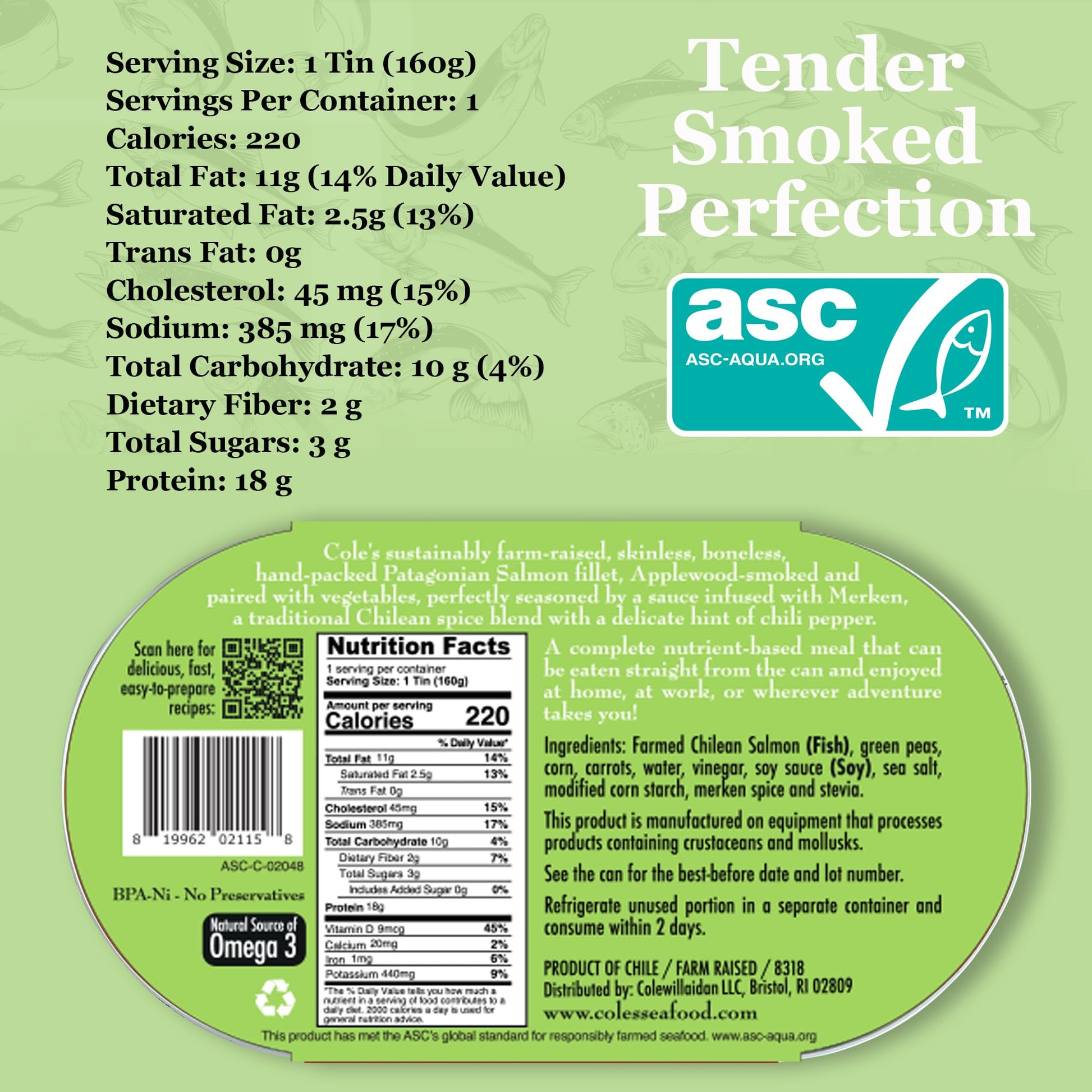 - Q: How much protein is in each can of Cole's Smoked Salmon? A: Each five point six ounce can of Cole's Patagonian Smoked Salmon Fillet contains nineteen grams of protein, making it a nutritious choice for high-protein diets.