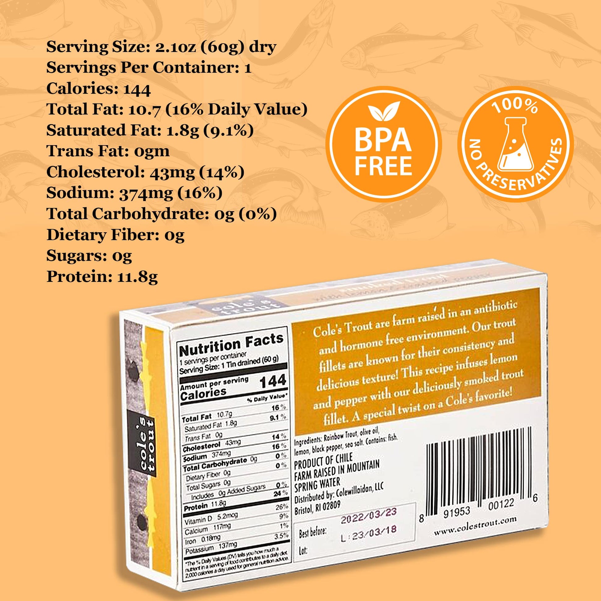 Coles Seafood is dedicated to sustainability and quality, ensuring that every bite of our smoked trout reflects our commitment to preserving the oceans and supporting local fishing communities. Our trout fillets are deboned and carefully smoked using a special recipe that infuses zesty lemon, black pepper, extra virgin olive oil, and sea salt. Each fillet is hand-packed in BPA-NI fully recyclable cans, maintaining exceptional quality and freshness. With a convenient 3.2 oz can, this product delivers 11.8 grams of protein per serving, making it a nutritious addition to any meal or snack.