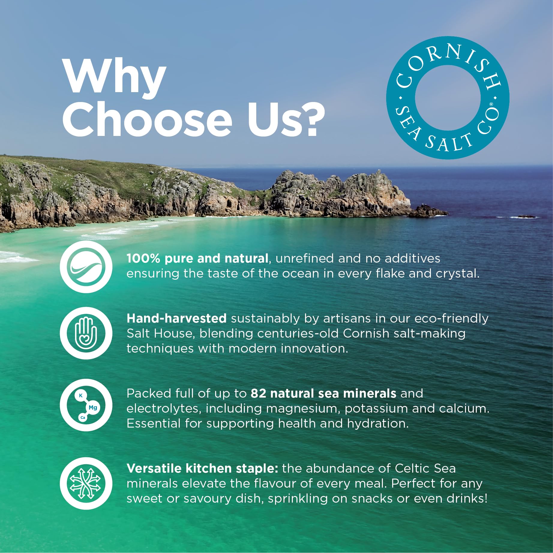 CRYSTALS: Crunchy crystal formation adds texture and delicious pockets of saltiness. Perfect for cooking and baking, from crispy baked potatoes and tasty roasted vegetables to fudgy brownies, caramel, and freshly baked bread. | NATURAL SEA MINERALS: Hand-harvested from the clearest ocean waters, our Sea Salt contains natural sea minerals derived from the unique geology surrounding the waters where its harvested. | FLAVOR PACKED: Perfect for cooking or baking to deliver a taste that really packs a punch and subtly complements any dish. The combined minerals from the harvested waters intensify the flavor, so less is needed overall for the same saltiness. | ELEVATES ANY MEAL: Our resealable sea salts are the perfect pantry staple for any kitchen and can be used in a variety of ways: as a finishing salt, swirled into sauces, sprinkled onto roasted meats and veggies or baked into pastries. | MICHELIN-STARRED CHEF APPROVED: Our sea salt is appreciated for the taste, quality, and versatility of artisan sea salt by Michelin-starred chefs and savvy home cooks in over 35 different countries, while continuing with traditions of humble beginnings on the south coast of Cornwall, England.