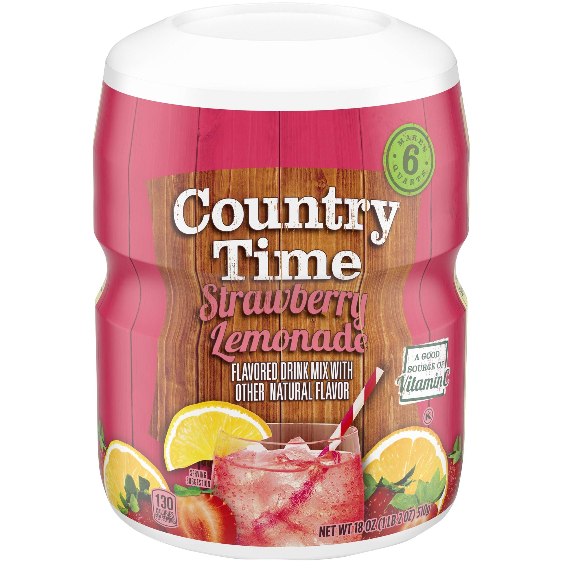 Country Time Naturally Flavored Strawberry Lemonade Powdered Drink Mix combines the great taste of summertime with the old-fashioned refreshment of Country Time. Made with real sugar and no artificial flavors, Country Time Strawberry Lemonade Powdered Drink Mix is the perfect drink to keep you cool on a summer afternoon. This powdered lemonade mix comes in a resealable canister and has an easy-measure lid for simple preparation. Each 18 ounce canister makes 6 quarts of flavored drink mix, so there is enough for the whole family to enjoy! To prepare, simply pour powdered drink mix into plastic or glass pitcher, add water and ice, stir, and serve! Enjoy the great taste of summer with Country Time!