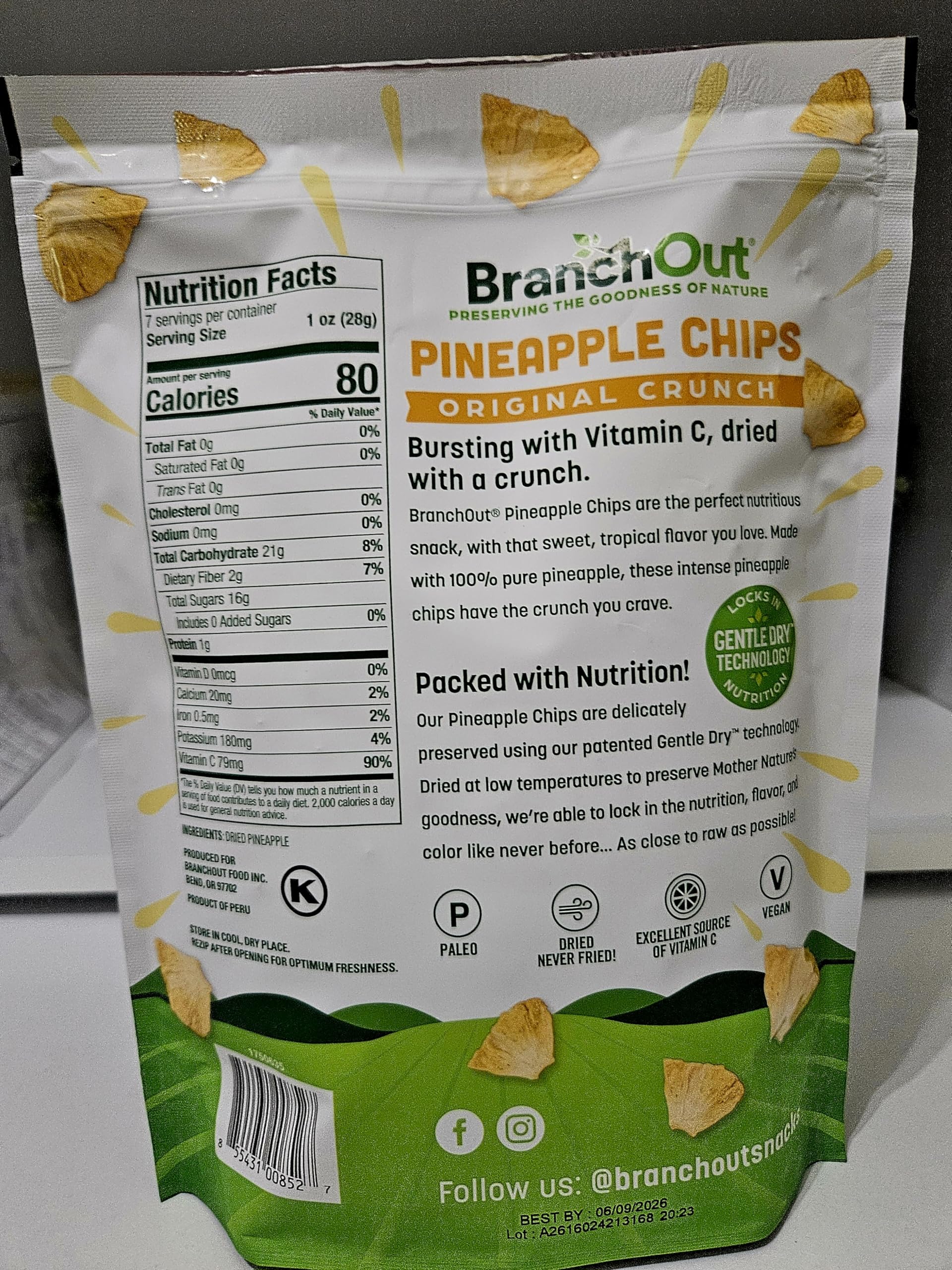 - Q: What are the nutritional benefits of CRISPY PINEAPPLE CHIPS? A: CRISPY PINEAPPLE CHIPS are packed with Vitamin C and contain all the natural goodness of pure pineapple. They are a healthy snack option that retains essential nutrients through our patented Gentle Dry* technology, ensuring you enjoy both flavor and health benefits.