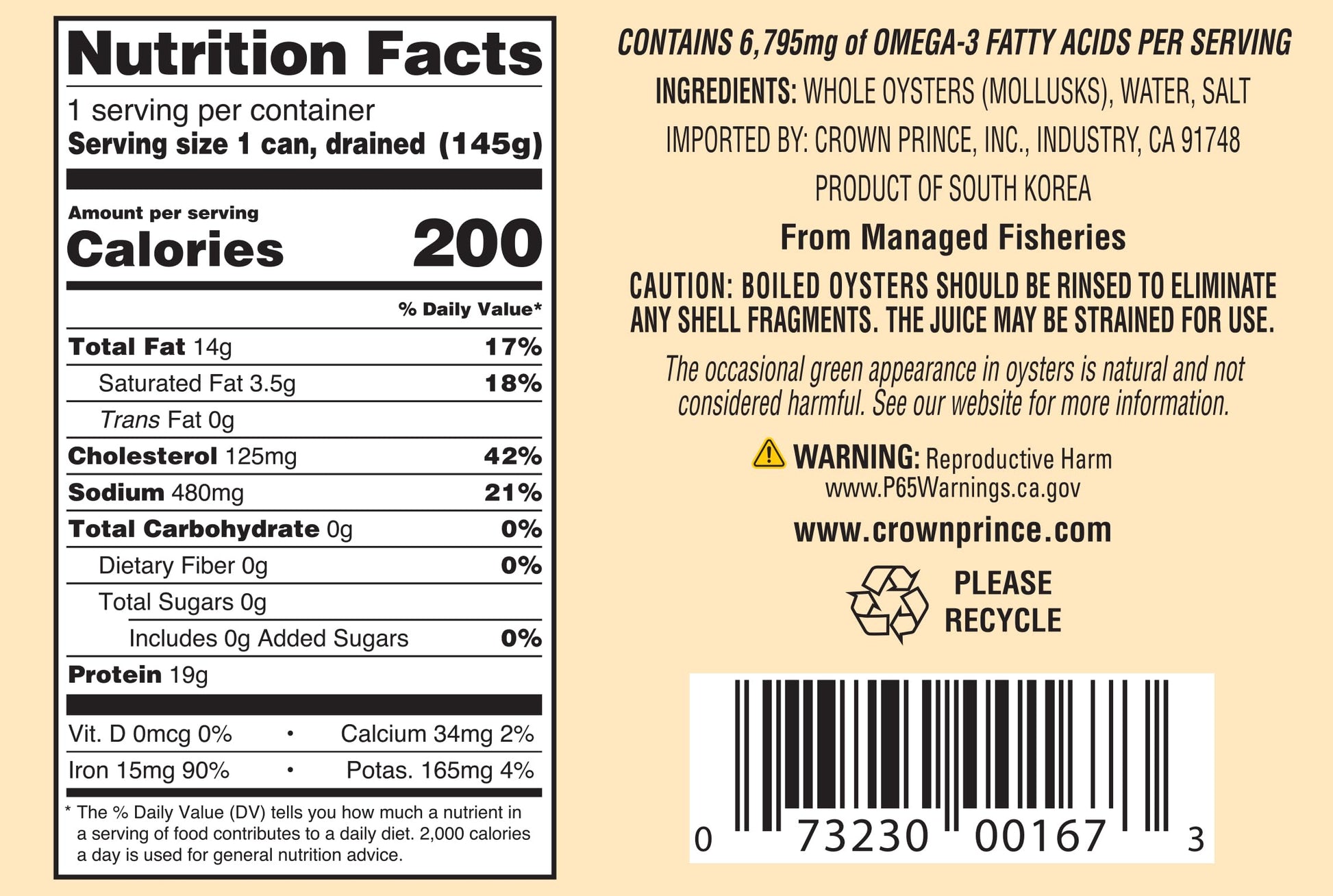 - Q: What nutritional benefits do Ocean Prince Boiled Oysters offer? A: Ocean Prince Boiled Oysters are an excellent source of protein and iron, providing six thousand three hundred twenty-five milligrams of omega-3 fatty acids per serving.