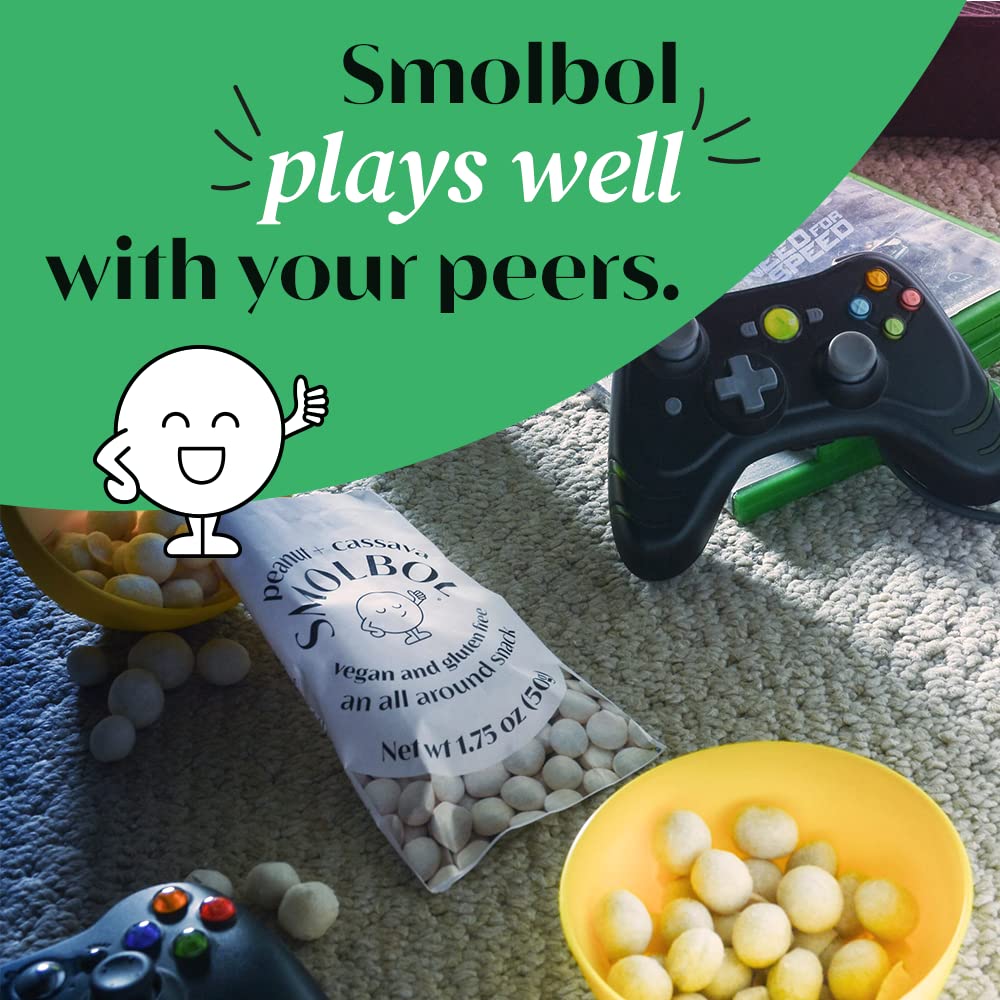 - Q: What are Smolbol Small Peanut Balls made of? A: Smolbol Small Peanut Balls are made from just six simple ingredients, featuring lightly roasted peanuts encased in a crunchy, lightly salted cassava crust. They are vegan and gluten-free, making them a wholesome snack option.