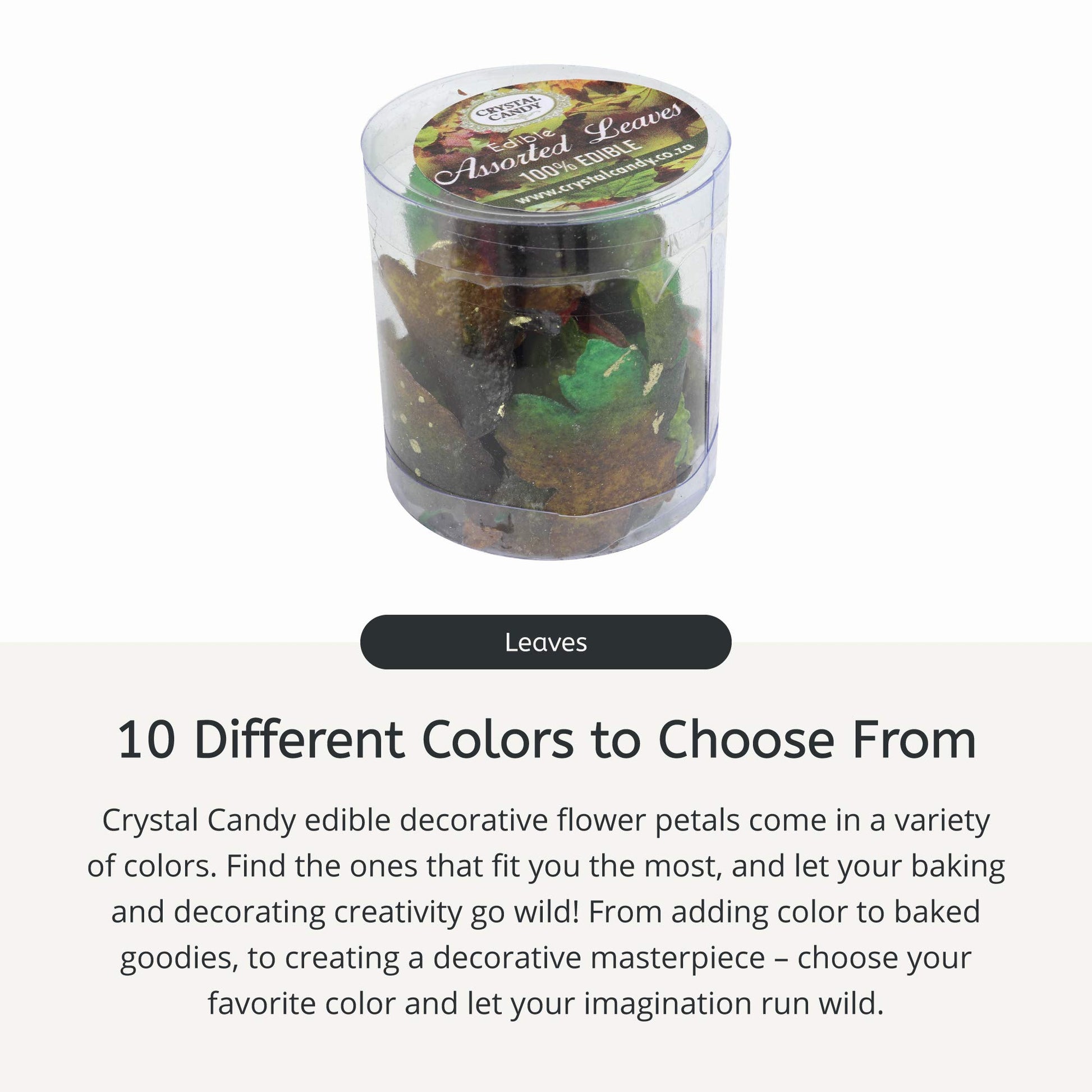 - Q: Do the edible leaves have any taste? A: Crystal Candy Edible Leaves are flavorless, allowing you to use them on any dessert without altering the taste of your baked goods.