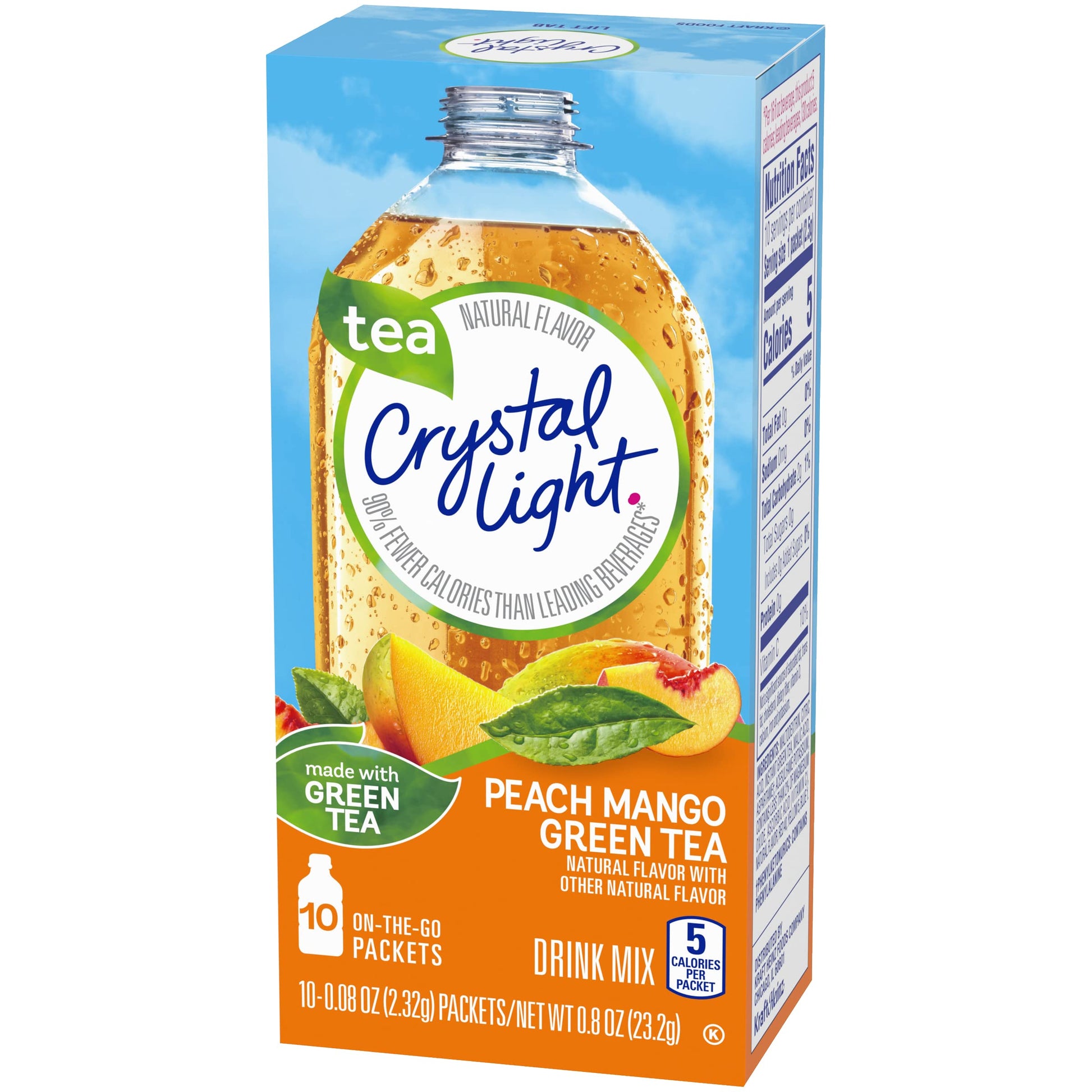 - Q: What is Crystal Light On The Go Peach Mango Green Tea Drink Mix? A: Crystal Light On The Go Peach Mango Green Tea Drink Mix is a low-calorie beverage mix that transforms ordinary water into a flavorful drink. Each serving contains only 5 calories, making it a great option for those looking to enjoy a refreshing drink without the added calories.