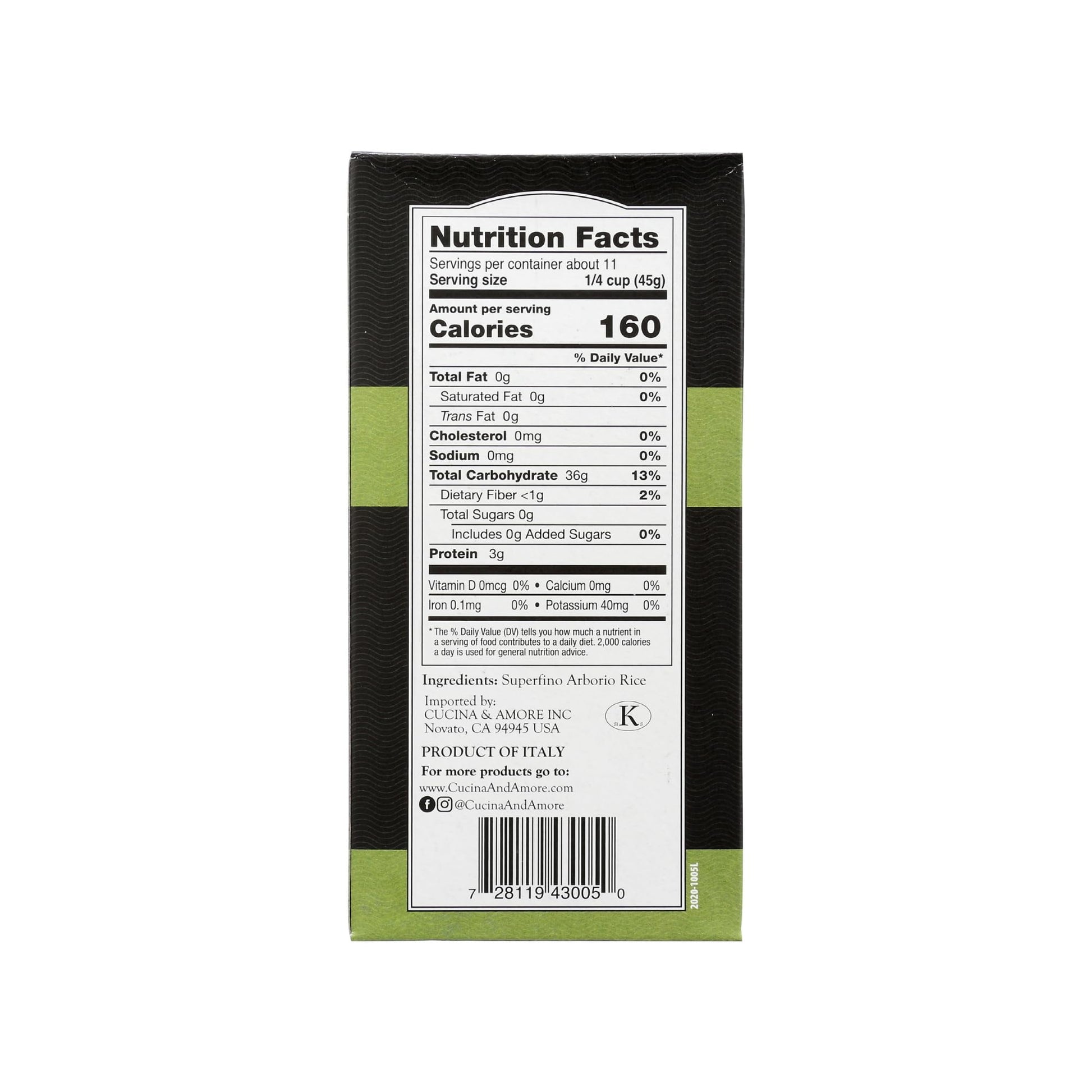 - Q: What makes Cucina & Amore Superfino Arborio Rice different from other types of rice? A: Cucina & Amore Superfino Arborio Rice is a short-grain rice known for its high starch content, which results in a creamy texture when cooked. Unlike other rice varieties, Arborio rice grains are larger and longer, allowing them to absorb liquids and flavors effectively while maintaining a firm bite—essential for creating authentic risotto.