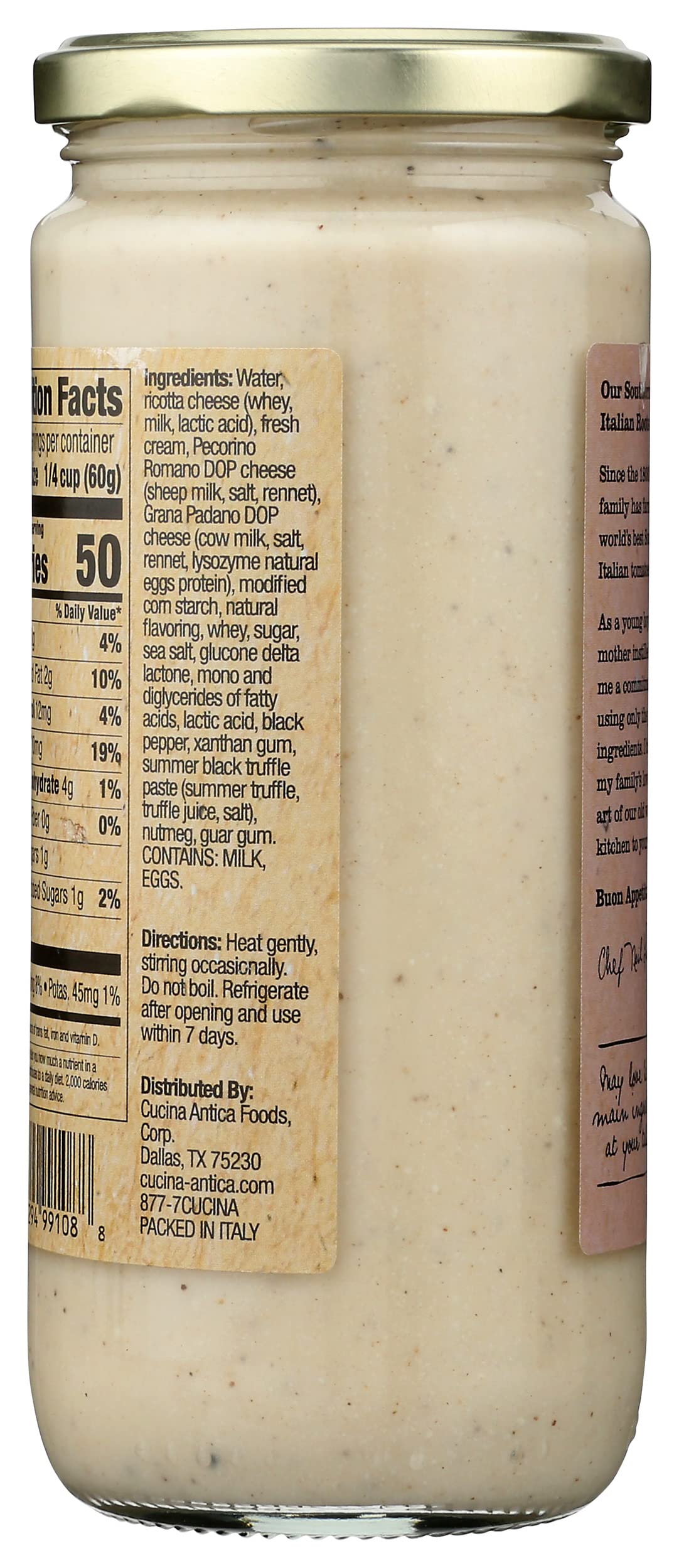 Q: What are the main ingredients in Cucina Antica Sauce Pasta Truffle Alfredo?A: Cucina Antica Sauce Pasta Truffle Alfredo contains high-quality ingredients without hydrogenated fats or high fructose corn syrup, ensuring a rich and authentic flavor.