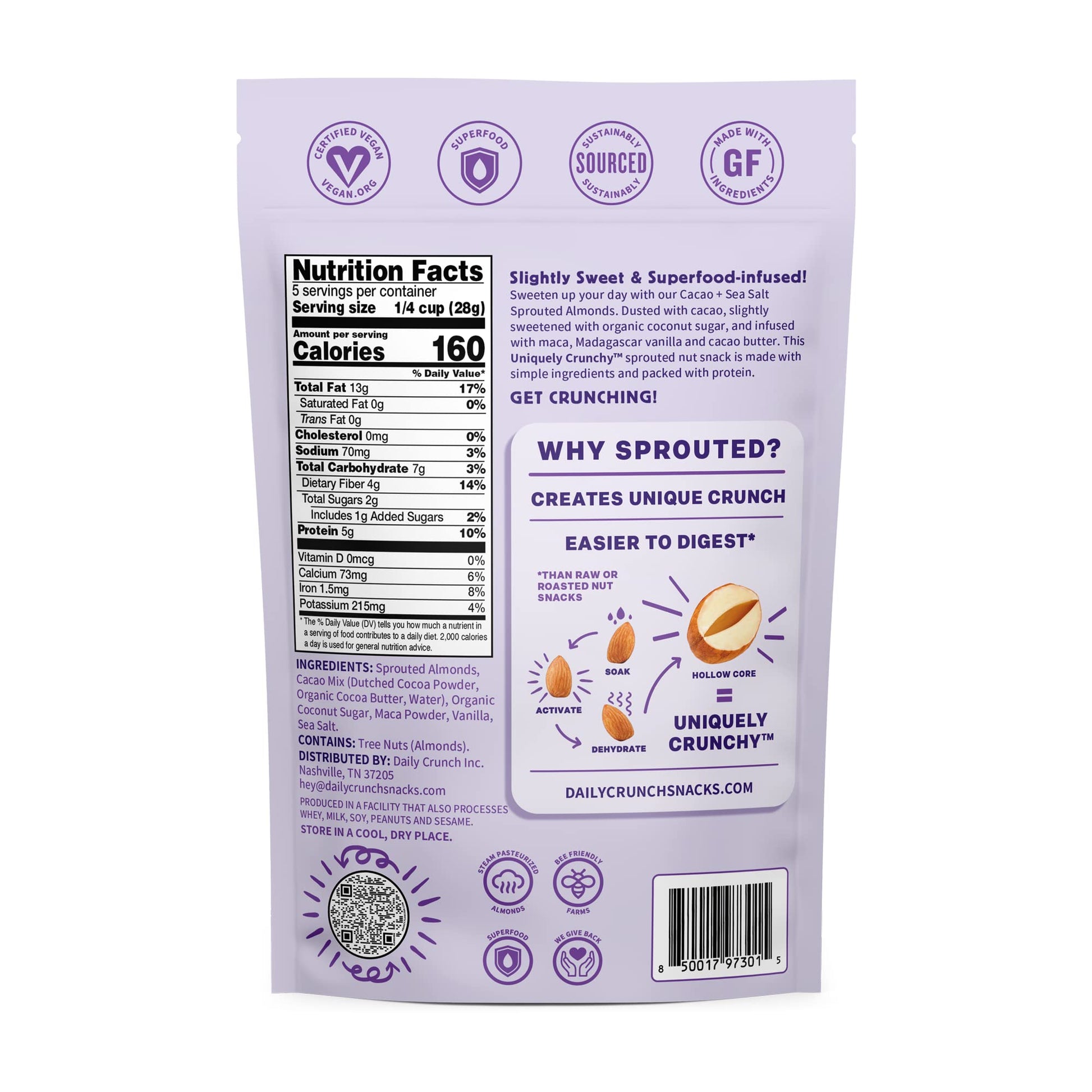 Daily Crunch Sprouted Almonds, 5 Ounce Resealable Bags (Cacao And Sea Salt, 6 Pack) - Sprouted And Dehydrated For A Unique Crunch, Keto Friendly, Non-Gmo, Oil And Salt Free, Vegan, Healthy Snack