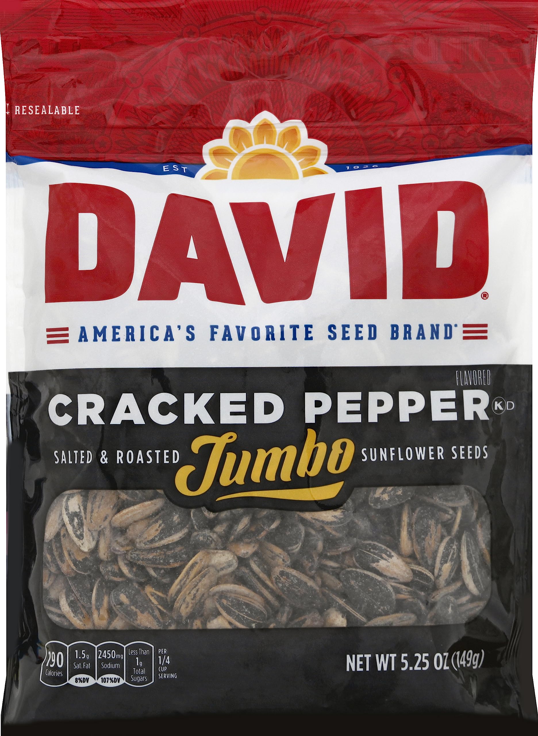 - Q: What makes DAVID Cracked Pepper Jumbo Sunflower Seeds a great snack? A: DAVID Cracked Pepper Jumbo Sunflower Seeds offer a satisfyingly crunchy texture and a savory cracked pepper flavor. They are a perfect snack for both group gatherings and solo munching, providing a delicious and energy-boosting option whenever hunger strikes.