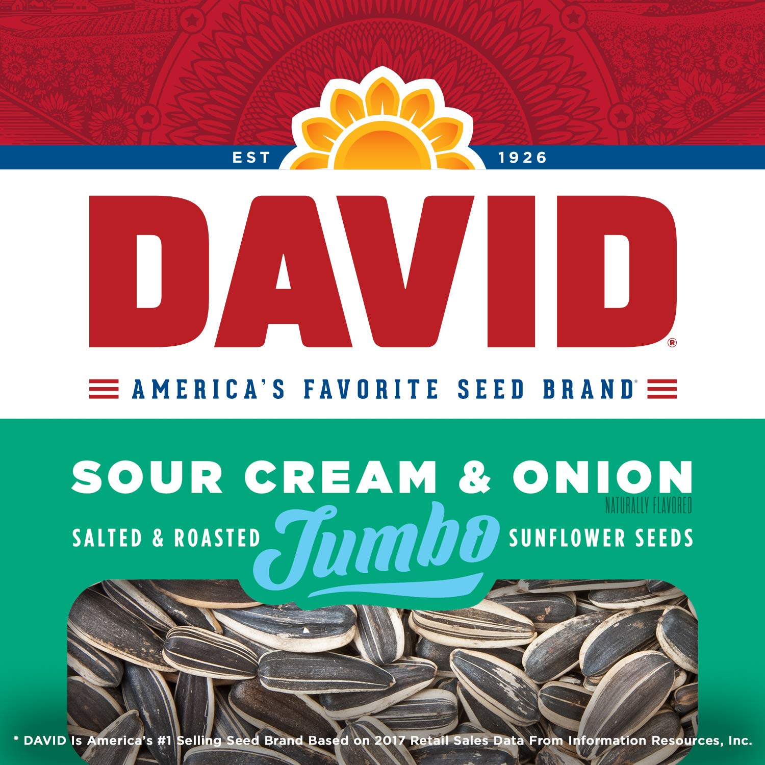 • Q: What makes DAVID Sour Cream and Onion Jumbo Sunflower Seeds different from regular sunflower seeds? A: DAVID Sour Cream and Onion Jumbo Sunflower Seeds are larger than standard sunflower seeds, providing a more satisfying crunch. They are uniquely flavored with a delicious sour cream and onion taste, and are roasted and salted for enhanced flavor.