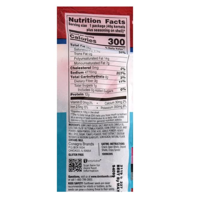 Q: What flavors do David Sunflower Seeds come in?A: David Sunflower Seeds are available in various flavors, with the Ranch Flavored variety being one of the most popular options. The ranch seasoning provides a zesty and tangy taste that enhances the natural crunch of the sunflower seeds.