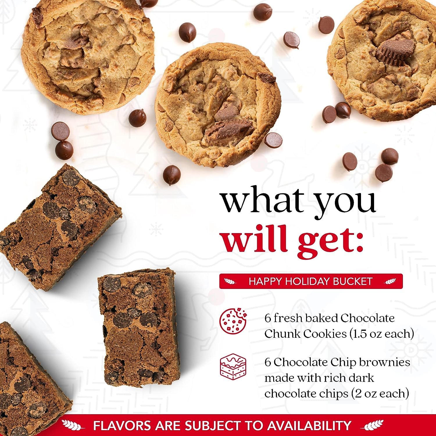 - Q: What are the key features of the David’s Cookies Happy Holiday Assorted Cookies Bucket? A: Key features include a variety of gourmet flavors, a beautifully designed tin bucket, and a combination of chocolate chunk cookies and chocolate chip brownies.