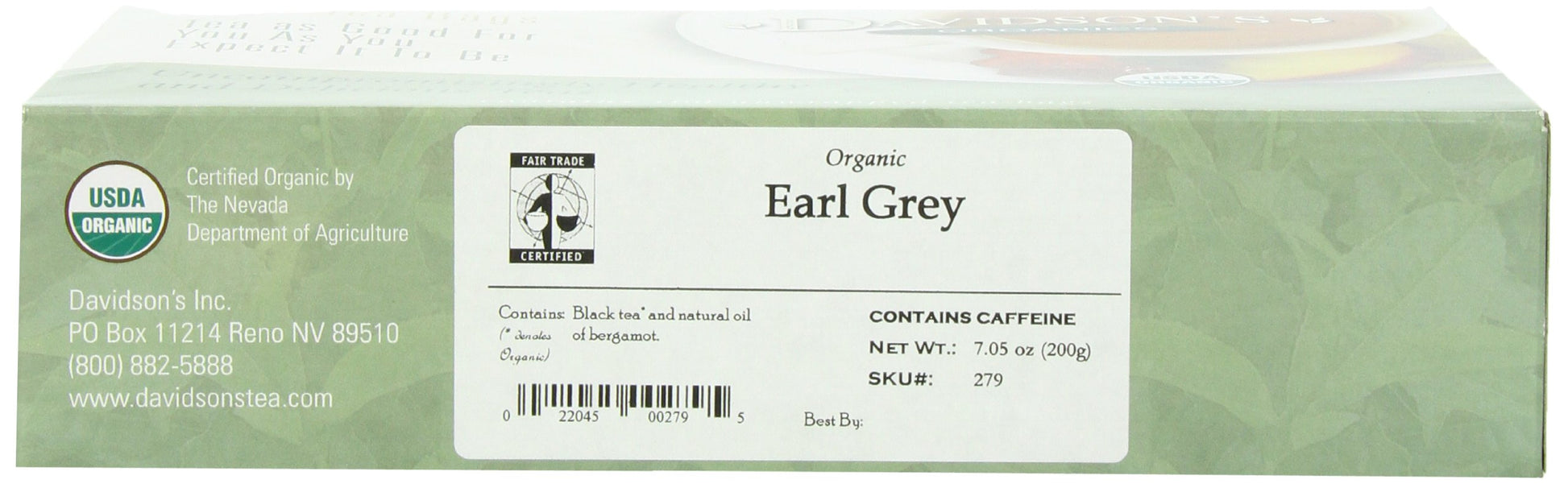 - Q: Is Davidson's Earl Grey tea suitable for people with dietary restrictions? A: Yes, Davidson's Organics Earl Grey tea is USDA certified organic, non-GMO, and free from harmful chemicals and pesticides, making it a suitable choice for those with dietary restrictions. However, it's always best to check the packaging for specific allergen information.