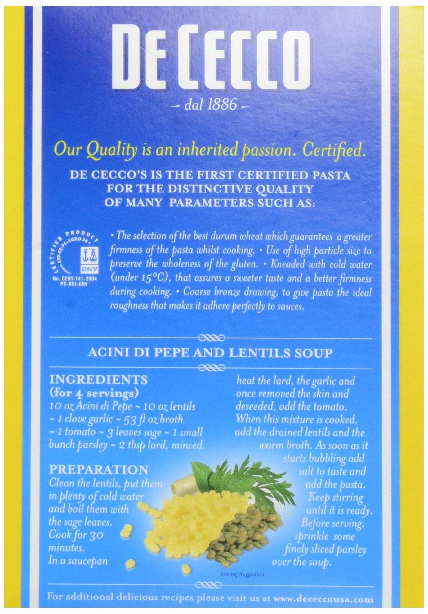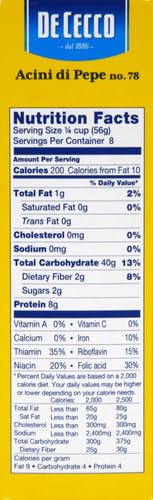 De Cecco gently grinds the heart of each grain, mixes it with cold spring water, then kneads the dough slowly. This results in pasta with the exceptional de Cecco aroma, flavor, and consistency. Pasta easily cooks to perfection, has a great firm texture, and a delicious “fresh” pasta taste. It has a rougher surface, which helps the sauce stick to it. Since 1886 we have liked our pasta to be bronze drawn and slowly dried because we like it to fall into the plate full of taste, rough and always "al dente". Even though our taste has not changed, as we feel the same love for tradition, we have continued to improve our production technologies. Make de Cecco pasta the secret ingredient for your most amazing dishes.Buon Appetito! Acini di Pepe (peppercorns) belong to the minute pasta family to be cooked in broth. This pasta shape was undoubtedly invented to stimulate the imagination of children who commonly eat this pasta in baby food and vegetable soups. It is shaped like peppercorns and is fun and appealing. It is especially good for preparing clear soups such as broths or consommé, enhanced with croutons or vegetables cut in julienne strips. This pasta can be used in thick creamy or velvety soups. Available in 16.0 oz pack.