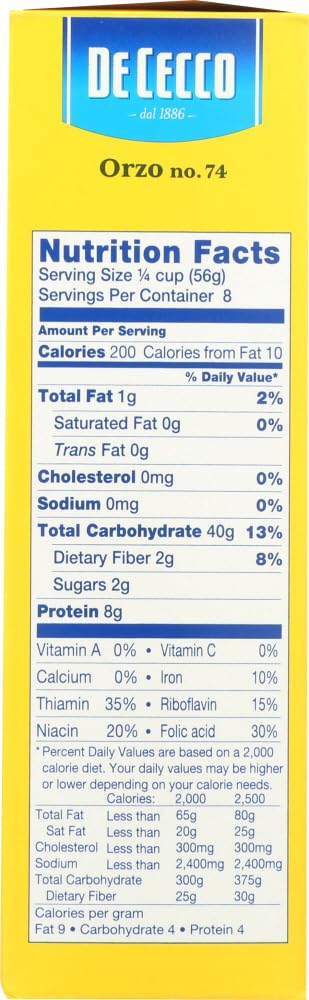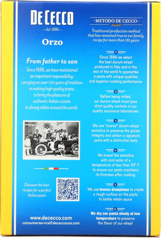 Q: What can I use De Cecco Orzo Pasta for in cooking?A: De Cecco Orzo Pasta is versatile and can be used in soups, salads, and as a side dish, making it an excellent choice for a variety of delicious recipes.