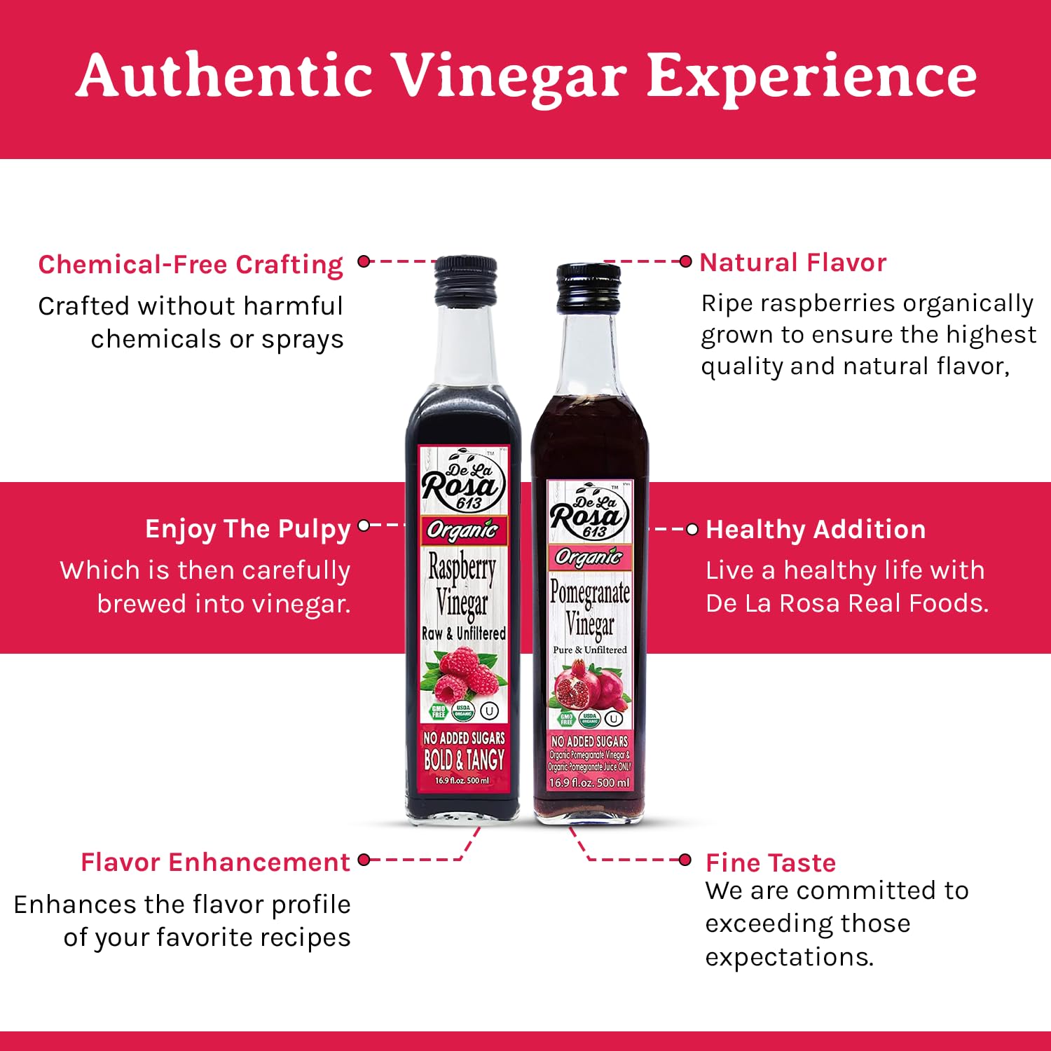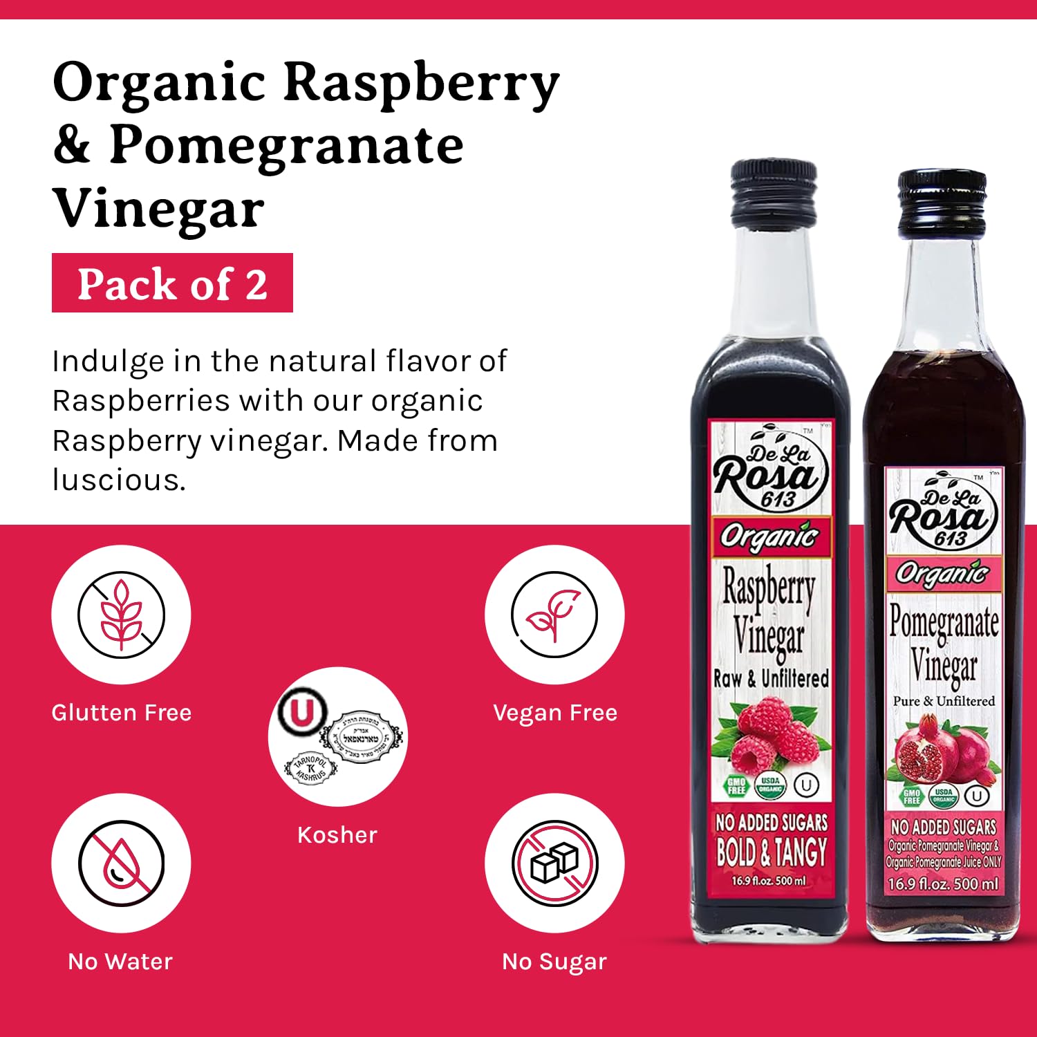 - Q: What are the health benefits of using De La Rosa Organic Raspberry & Pomegranate Vinegar? A: De La Rosa Organic Raspberry & Pomegranate Vinegar is USDA certified organic, non-GMO, vegan, and gluten-free, making it a healthy addition to your meals. It contains no additives, preservatives, sugar, or water, ensuring you consume only the purest ingredients. The vinegar can aid digestion, enhance flavors, and is a great alternative to traditional dressings.