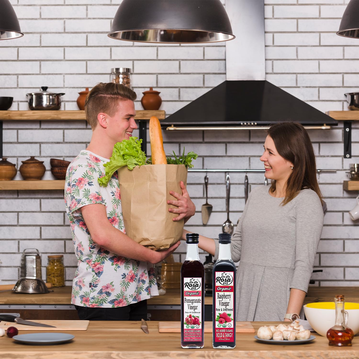 - Q: What packaging does the vinegar come in, and why is it important? A: De La Rosa Organic Raspberry & Pomegranate Vinegar is packaged in premium glass bottles. Glass helps preserve the original flavor and aroma of the vinegars, ensuring that you experience the purest and most authentic taste with every use. The elegant packaging also adds a touch of luxury to your kitchen.