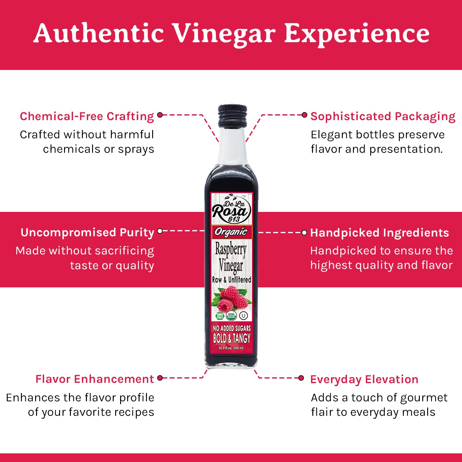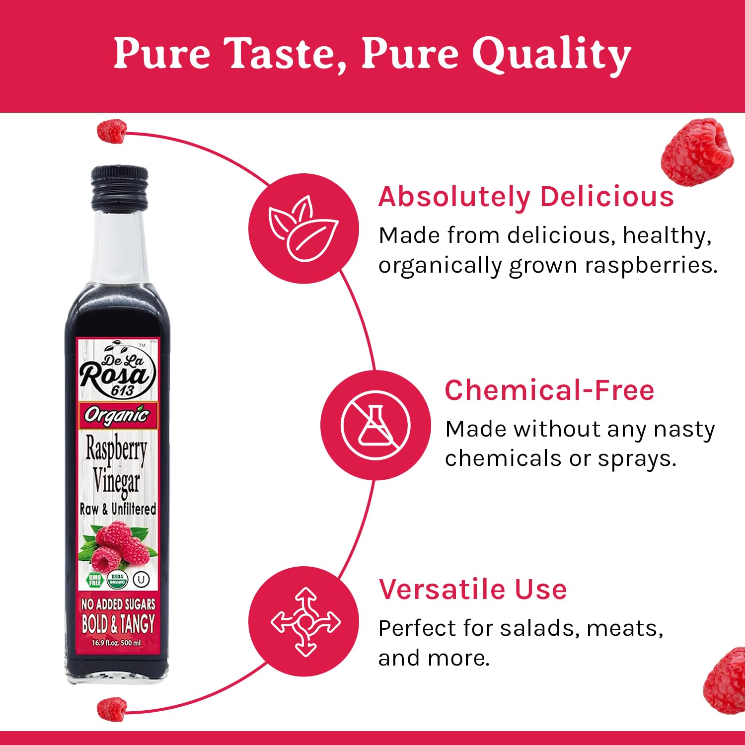 Experience The Best Flavor With Every Bite, Thanks To De La Rosa Real Foods Pure Raspberry Vinegar. These Sweetened Vinegars Are The Epitome Of Taste, Made With Pure, Organic Raspberry. Experience The Natural, Unadulterated Taste Of These Vibrant Fruits In Every Dish. Forget Bland And Boring Food, And Say Hello To A Taste Explosion! Healthy And Wholesome De La Rosa Real Foods Organic Vinegar Is Not Just Delicious, They'Re Also Good For You. Our Raspberry Vinegar Is Usda Certified, Meaning It'S Made With The Highest Quality Organic Ingredients. And With No Preservatives, Additives, Or Sugar, You Can Feel Good About What You'Re Putting In Your Body. Our Vinegar Is Also Non-Gmo, Vegan, And Gluten-Free, Making It Suitable For Those With Dietary Restrictions. Kosher Certified For Optimal Flavor And Peace Of Mind Whether You Follow A Kosher Diet Or Simply Want An Organic Option, Our Vinegar Is The Ideal Choice. Made With Precision And Care, Our Kosher-Certified Vinegar Adds A Burst Of Flavor To Your Meals, While Ensuring You Stick To Your Health Objectives. Enjoy A Culinary Delight With Peace Of Mind. Elevate Your Meals With Elegance Transform Your Dishes Into Something Special With De La Rosa Real Foods Raspberry Vinegar. Whether You'Re Dressing Up A Salad, Marinating Your Chicken, Or Adding A Tangy Twist To Your Pasta, Our Premium Raspberry Vinegar Is The Perfect Ingredient To Enhance The Flavor Of Any Dish. And, With Its Beautiful Solid Glass Bottle, You Can Add A Touch Of Sophistication To Your Kitchen Or Dining Table. Don'T Settle For Ordinary, Elevate Your Taste Buds To New Heights With De La Rosa Real Foods Raspberry Vinegar. Get Your Bottle Today And Experience The Ultimate Taste Sensation In Every Bite!