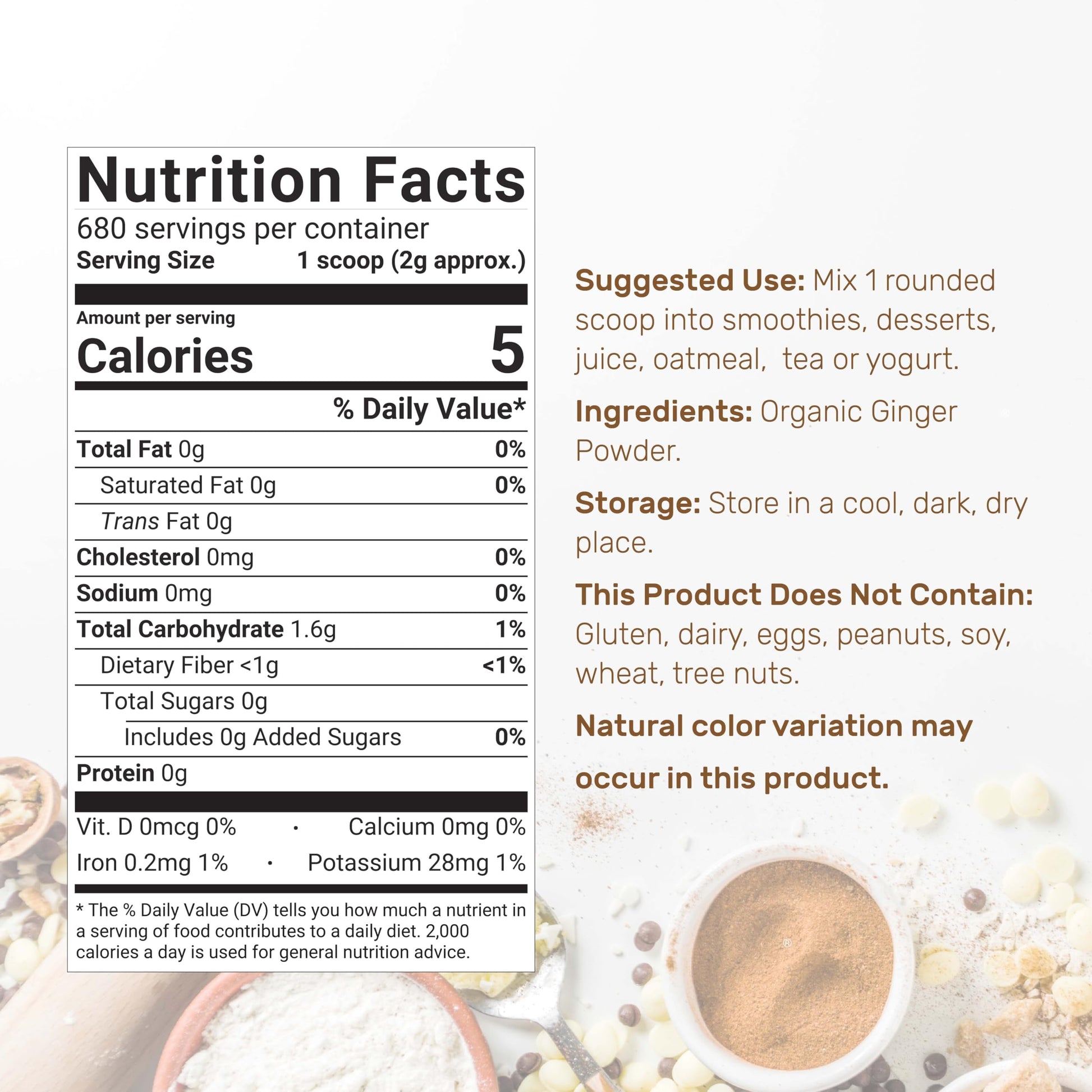 - Q: What is the recommended serving size for the ginger powder? A: The recommended serving size is approximately two grams, which is equivalent to one scoop of the ginger powder.