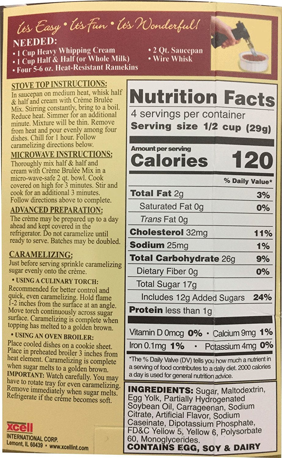 - Q: What is included in the Crème Brulee mix package? A: The package includes the Crème Brulee mix and a sugared topping for caramelizing, allowing you to achieve that gourmet touch right at home.