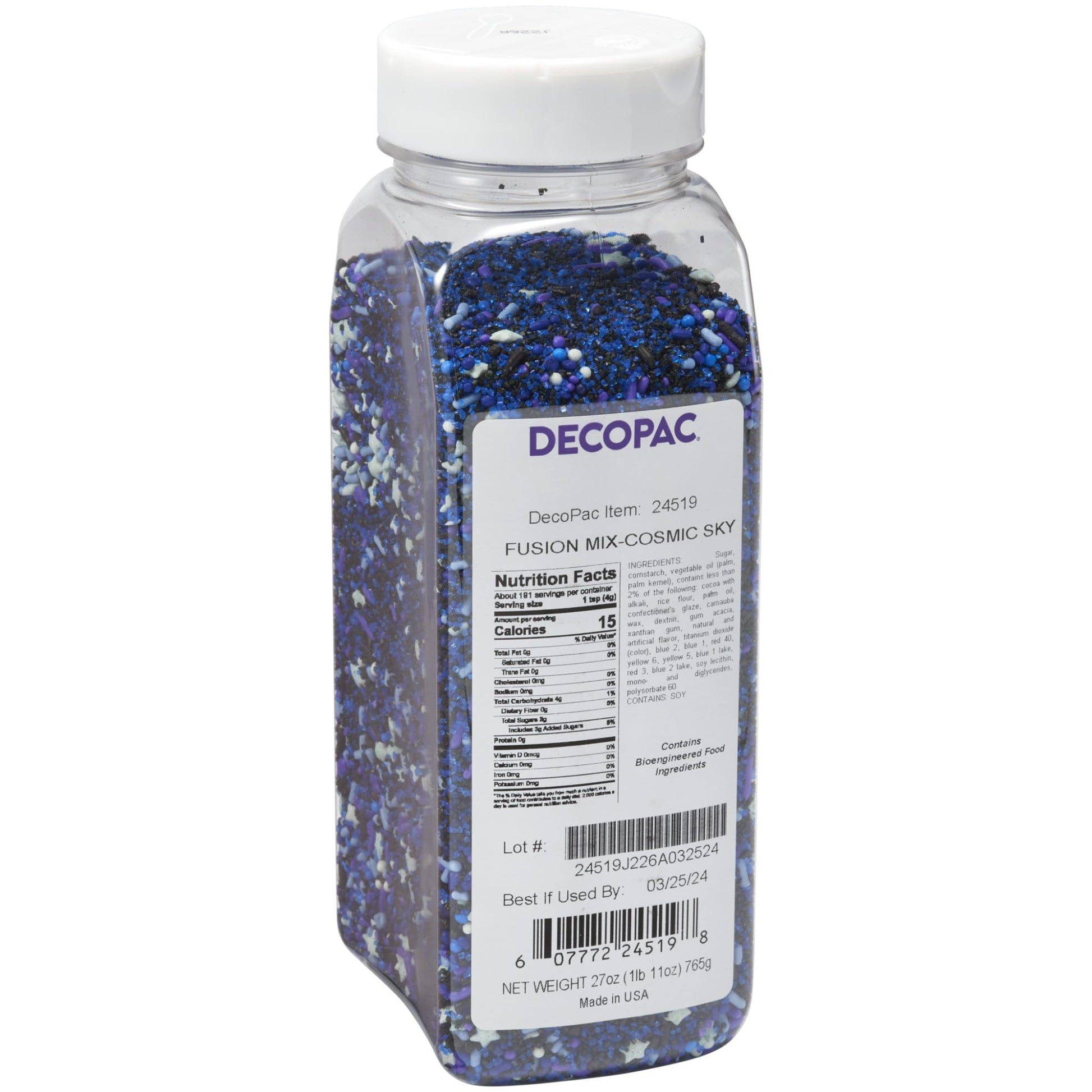 • Q: What are the main ingredients in DECOPAC Cosmic Skies Fusion Mix Candy Sprinkles? A: DECOPAC Cosmic Skies Fusion Mix Candy Sprinkles consist of a blend of sprinkles, quins, nonpareils, pearls, and sanding sugars, all of which are 100% edible and food-safe.