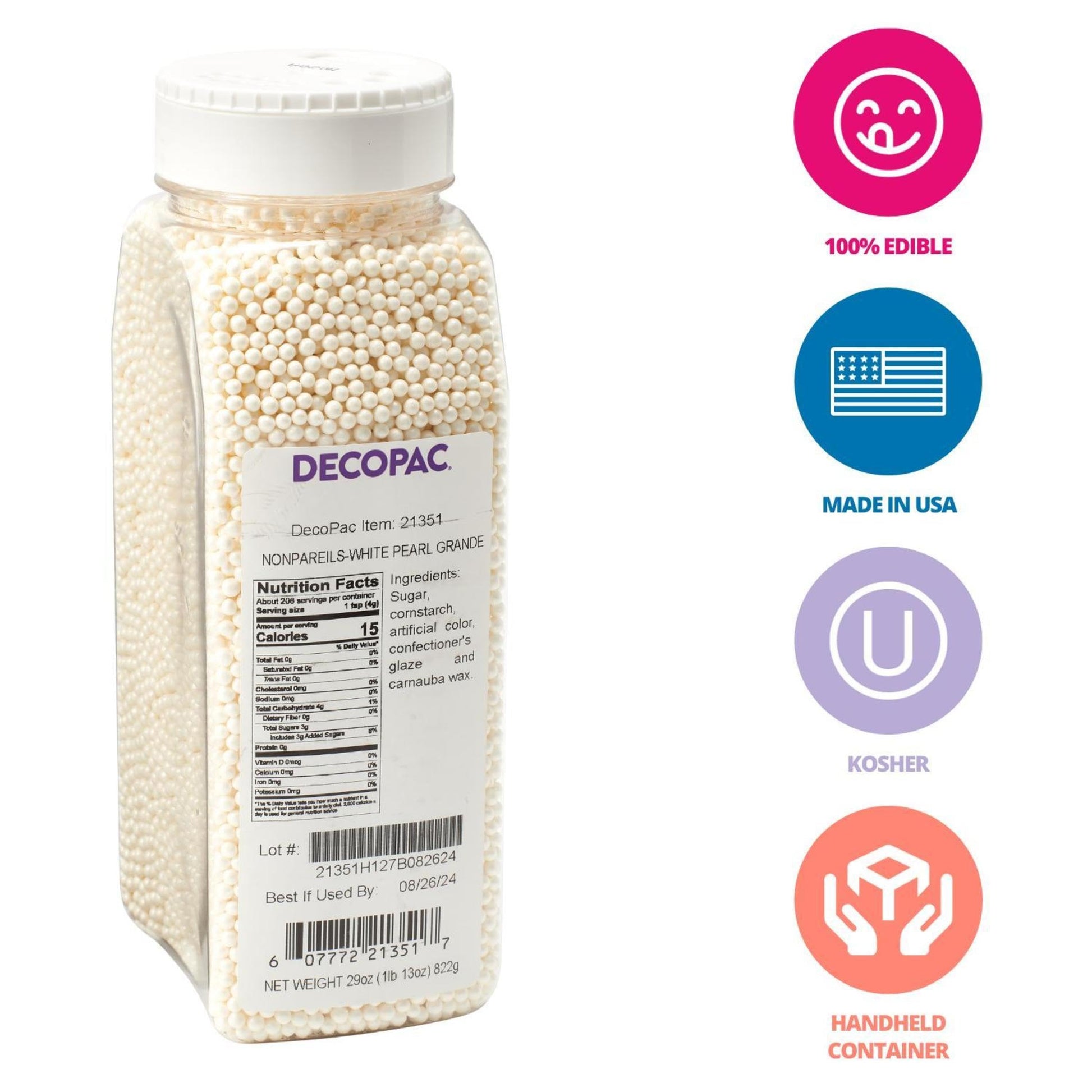 - Q: What are DecoPac White Pearl Grand Nonpareils made of? A: DecoPac White Pearl Grand Nonpareils are made from high-quality edible ingredients, specifically designed to be 100% safe for consumption. They are free from hydrogenated oils and are kosher certified.