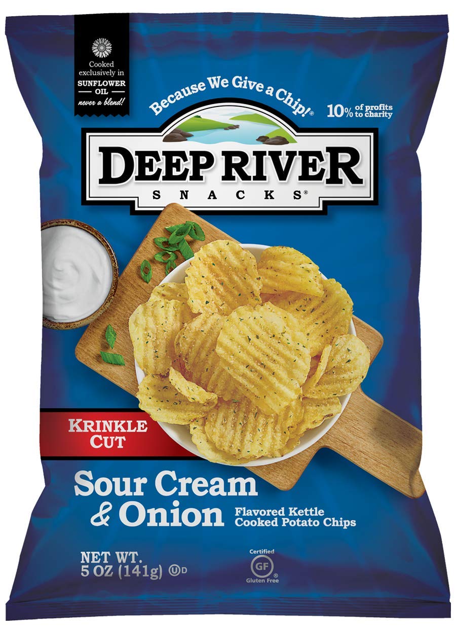 - Q: How many bags are included in the Deep River Snacks Sour Cream & Onion variety pack? A: The Deep River Snacks Sour Cream & Onion Kettle Cooked Potato Chips come in a variety pack that includes 12 bags, each containing 5 ounces of delicious kettle-cooked chips.