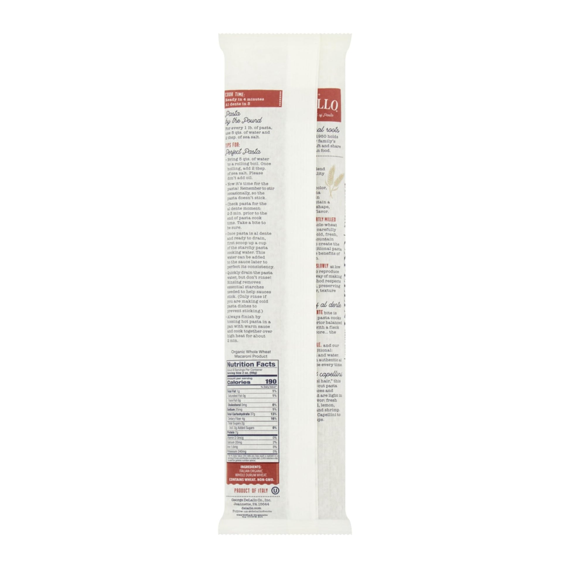 Whole-Wheat Capellini, also known as angel hair, is a super thin long-cut of pasta that shines with sauces and ingredients that are light in texture and flavor. Whole-wheat pasta is heart-healthy pasta that is made with durum wheat semolina-a wheat flour that uses all parts of the grain. Made in Italy, DeLallo Organic Whole-Wheat Pasta begins with a high-quality blend of organic durum wheat. Wheat is chosen for its beautiful color, wonderful aroma and high protein content and is ground into whole durum wheat flour, then kneaded with rich mountain spring water for everything you love about traditional pasta, but with the benefits of whole grains. True to tradition, we dry our pasta slowly at low temperatures to retain the pastas taste, texture, and aroma. Capellini is best when paired with sauces that will not overwhelm its delicate shape. Try cappellini with fresh tomato, olive oil, lemon, basil, scallops, and shrimp or even add the fine strands of pasta to broth-based soups.