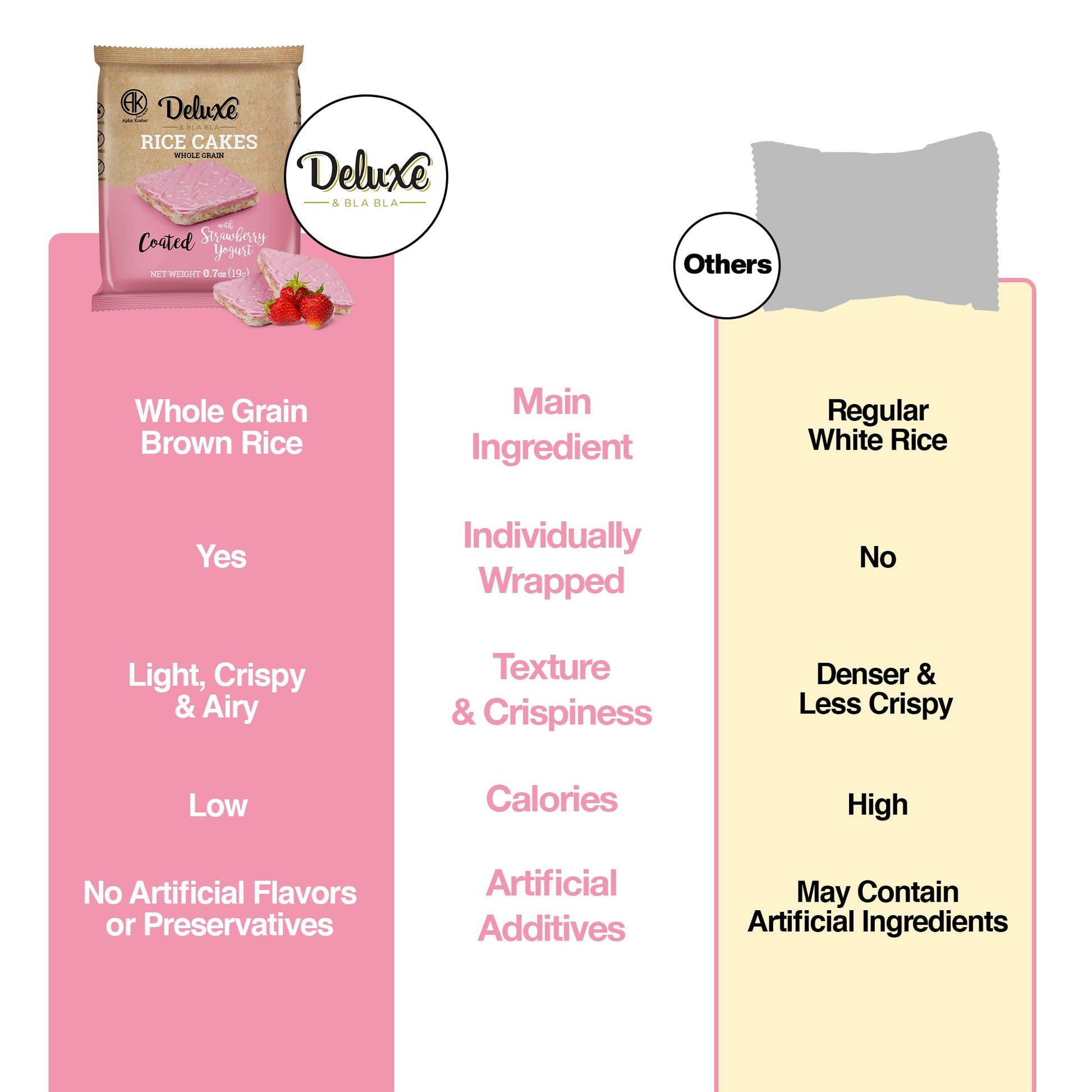 Q: What are the main ingredients in Deluxe & Bla Bla Rice Cakes?A: The Deluxe & Bla Bla Rice Cakes are made from whole grain rice and are coated with strawberry yogurt. They contain no artificial flavors, colors, or preservatives, making them a healthy and guilt-free snack option.