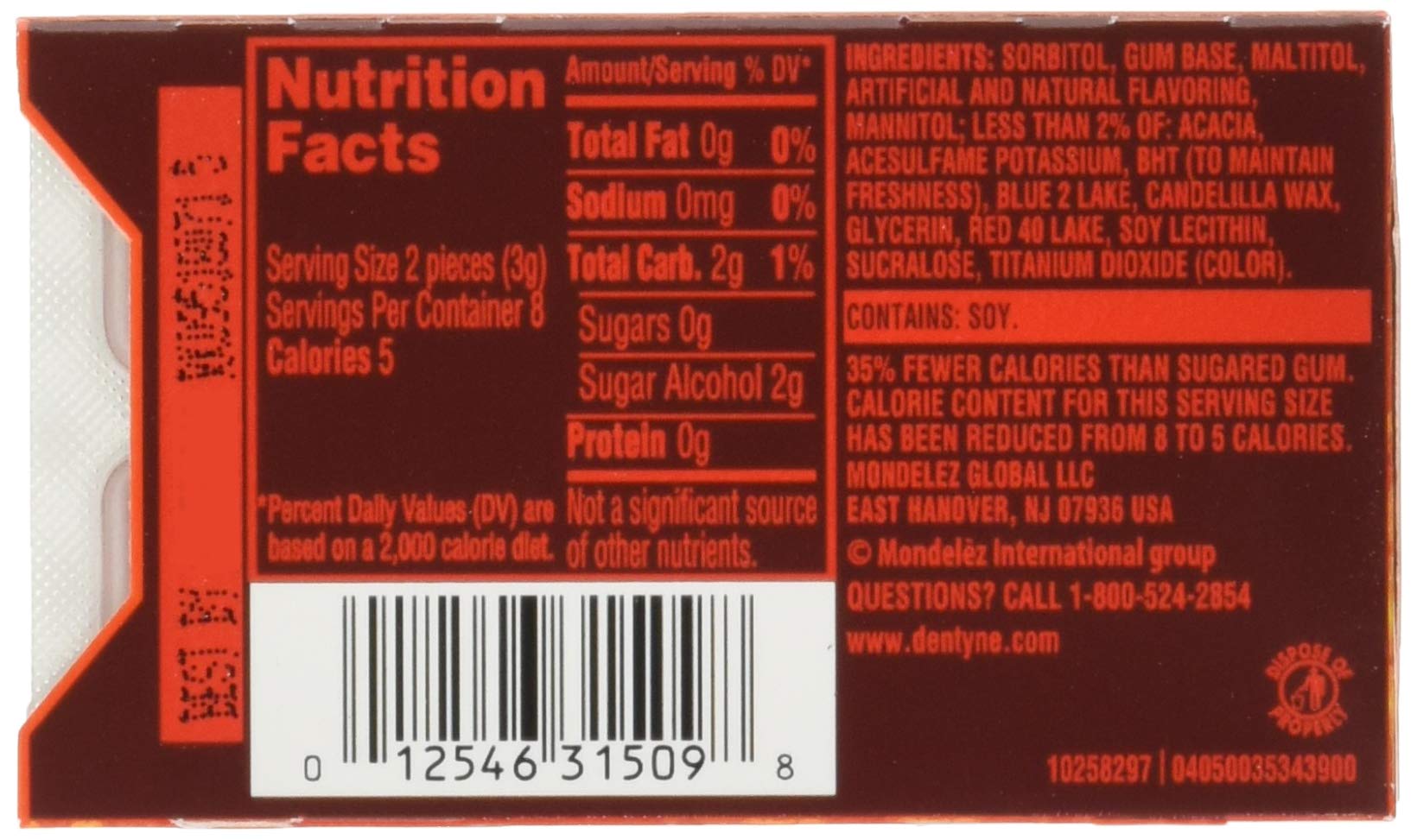 Q: Is Dentyne Fire Spicy Cinnamon Gum suitable for people with dietary restrictions?A: Yes, Dentyne Fire Spicy Cinnamon Sugar-Free Gum is sugar-free, making it suitable for individuals managing their sugar intake. However, please check the ingredient list for any allergens.