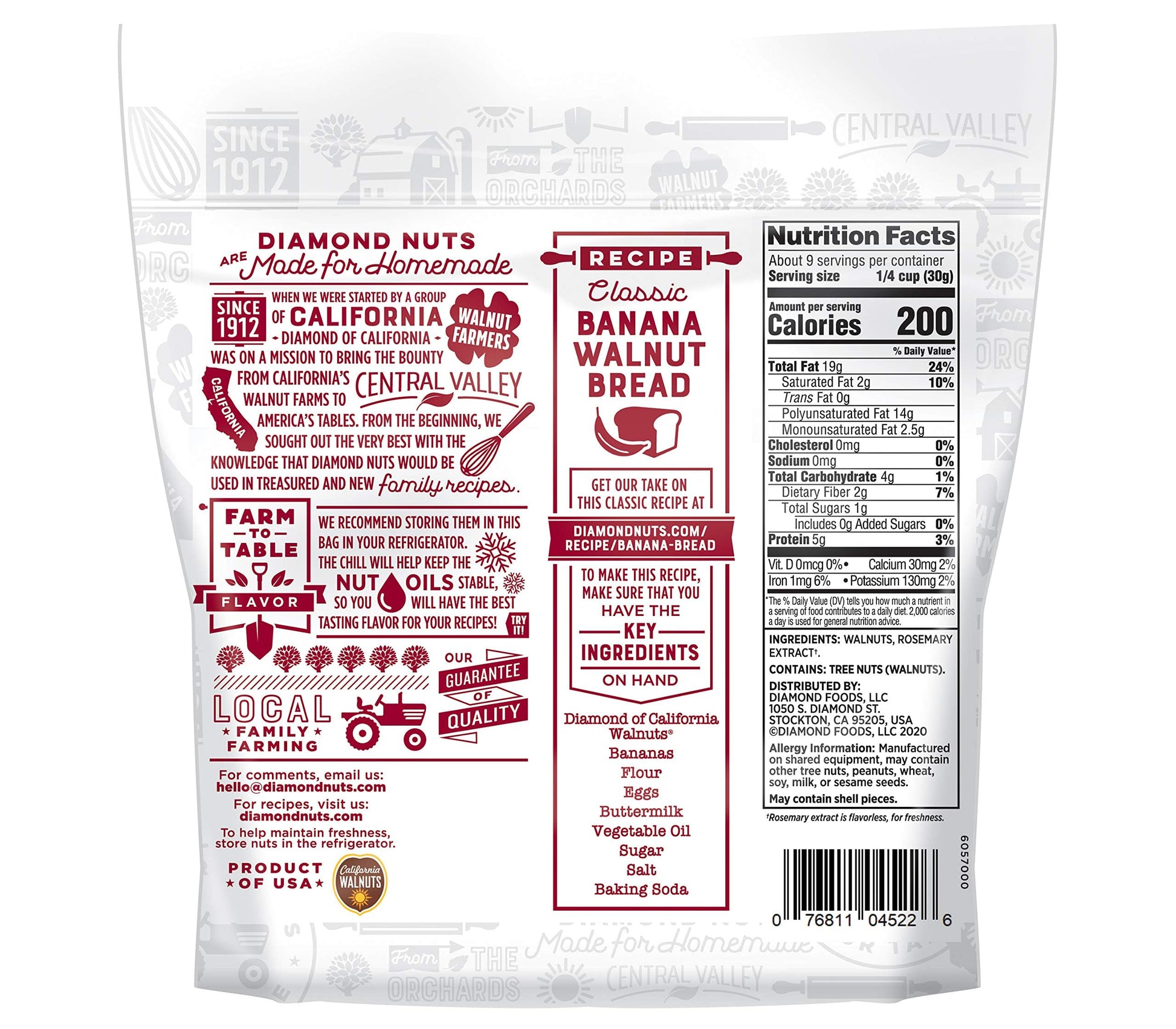 - Q: What is the packaging size of the Diamond of California finely diced walnuts? A: The product comes in a convenient 10 oz size and is available in a 12-pack, making it easy to stock up and ensure you always have fresh walnuts on hand for your cooking and baking needs.
