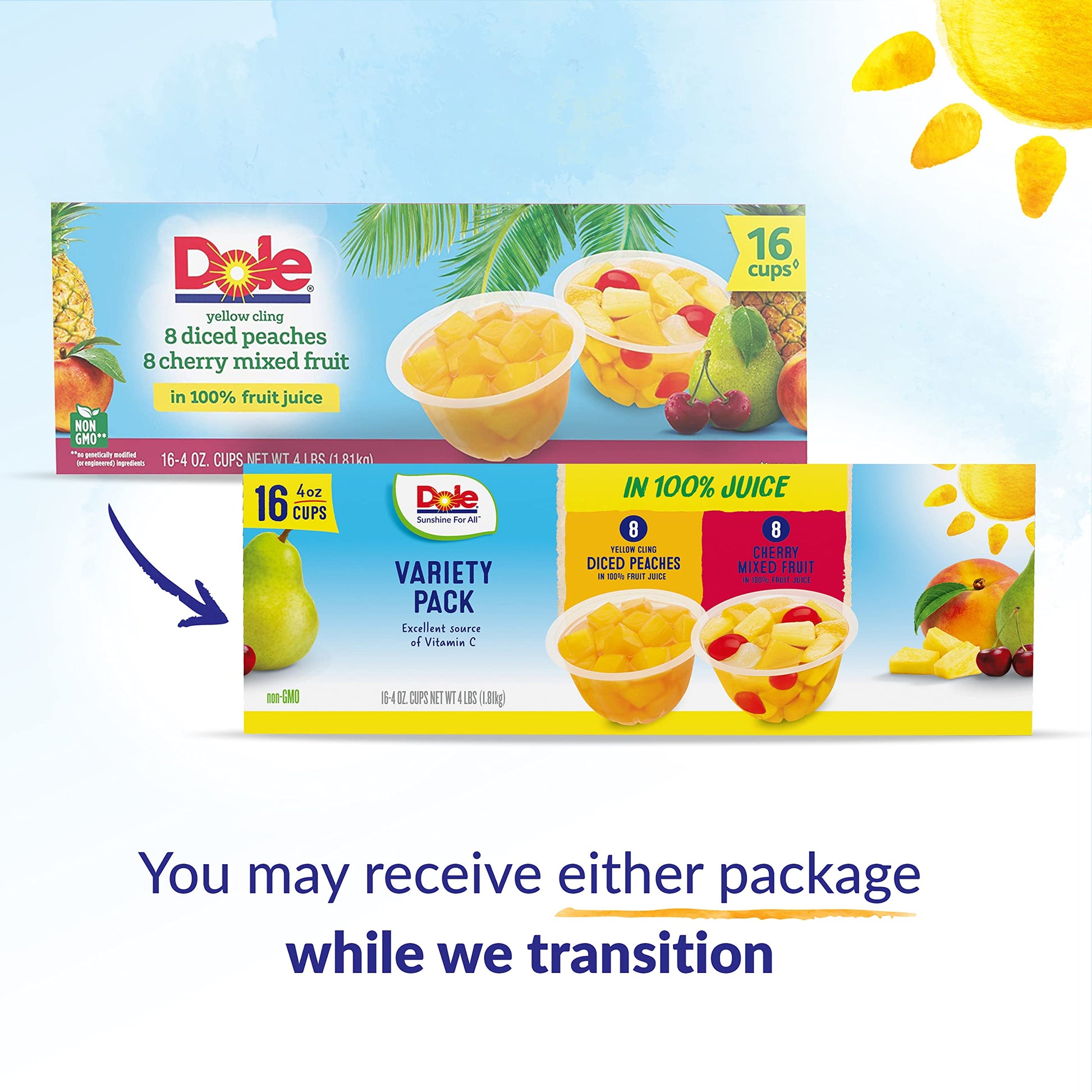 Dole Fruit Bowls, Diced Peaches and Cherry Mixed Fruit Variety Pack Snacks, 4oz 16 Total Cups, Gluten & Dairy Free, Bulk Lunch S