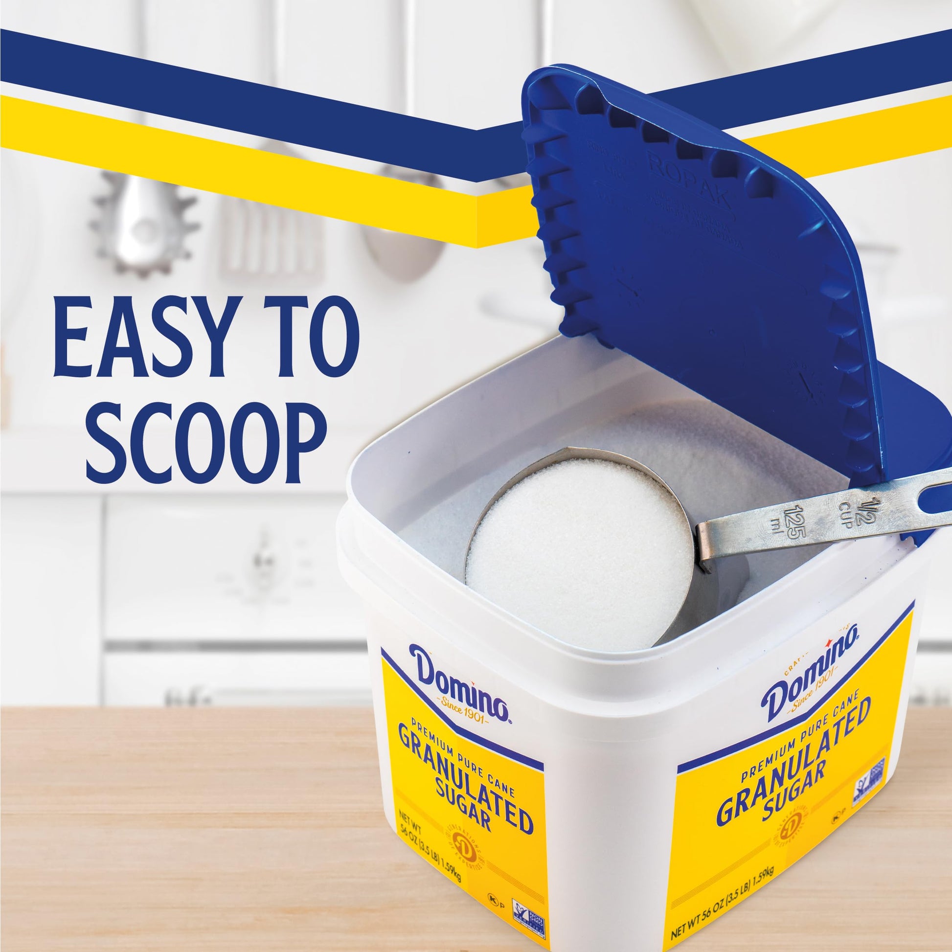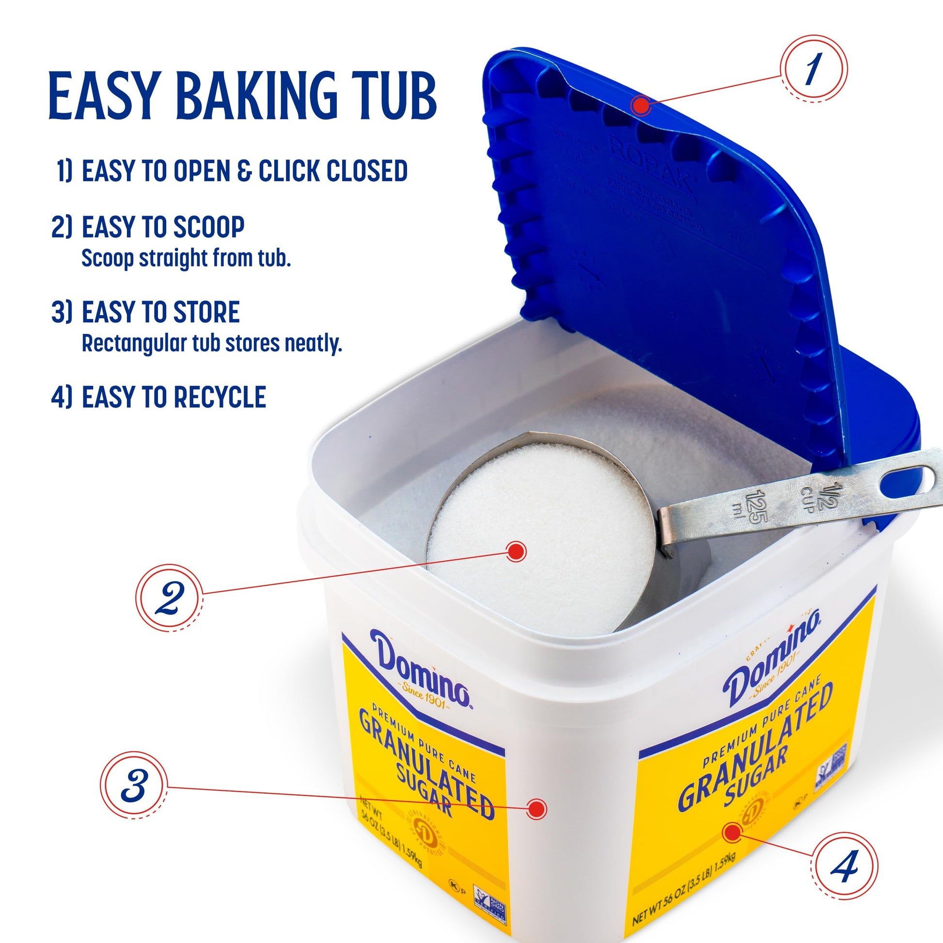 Since 1901, Domino Sugar Has Been The Trusted Partner For Generations Of Bakers. Our Commitment To Quality And Expert Craftsmanship Is Our Enduring Promise To You. We Use The Highest Standard To Maintain The Naturally Sweet Flavor Found In The Sugarcane Plant. We Dont Take Sugar Lightly, And We Know You Dont Either. Our Easy Baking Tub Will Make Your Baking More Convenient. Domino Granulated Sugar Is Scoopable Directly From The Tub Which Clicks Closed For Confident Resealing. Plus, The Rectangular Tub Is Easy To Store, And It Even Has Windows To See When The Sugar Is Running Low.
