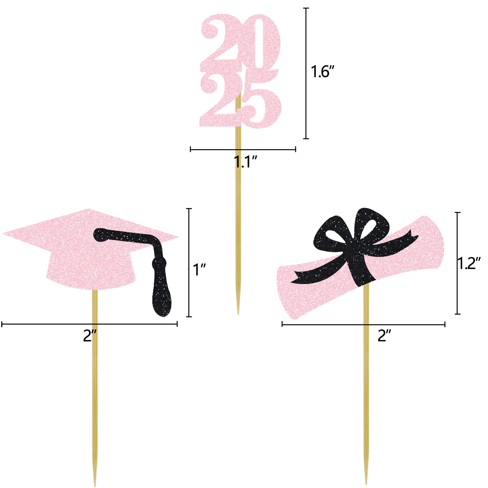 Q: How many cupcake toppers are included in the package?A: The package includes a total of 24 cupcake toppers, featuring 8 pink grad cap toppers, 8 pink number '2025' toppers, and 8 pink diploma toppers with black bows.