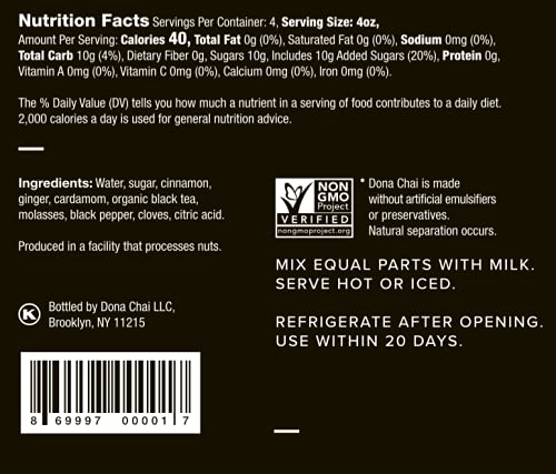• Q: What are the main ingredients in Dona Original Masala Chai Concentrate? A: Dona Original Masala Chai Concentrate is made with purified water, sugar, ginger, cinnamon, green cardamom, organic black tea, molasses, black pepper, cloves, and citric acid. These ingredients are carefully selected to create a rich and flavorful chai experience.