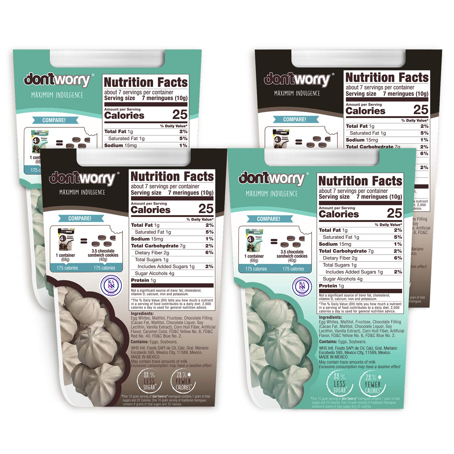 - Q: How many calories are in each cookie? A: Each Don't Worry Meringue Cookie contains only 4 calories, allowing you to enjoy a sweet treat without compromising your diet.