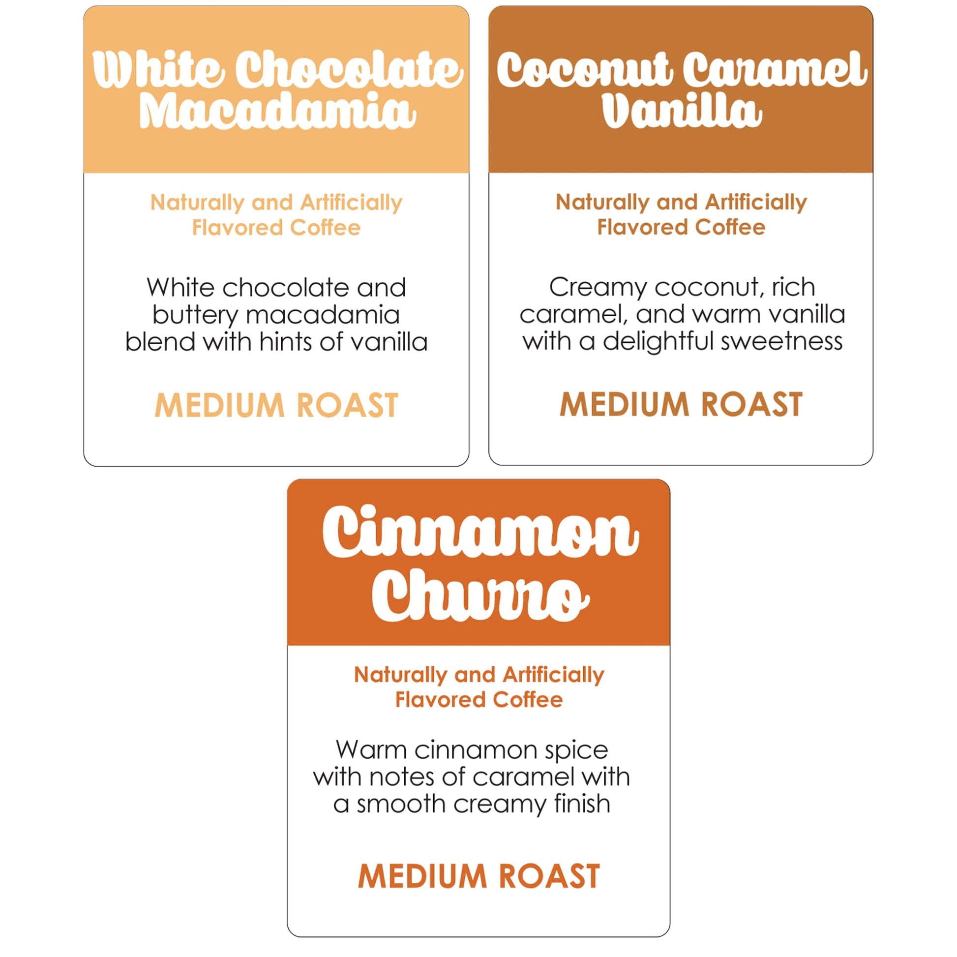Q: What flavors are included in the Donut Cafe Paradise Pack?A: The Donut Cafe Paradise Pack includes three delicious flavors: 20 White Chocolate Macadamia, 20 Coconut Caramel Vanilla, and 20 Cinnamon Churro, providing a delightful variety for flavored coffee lovers.