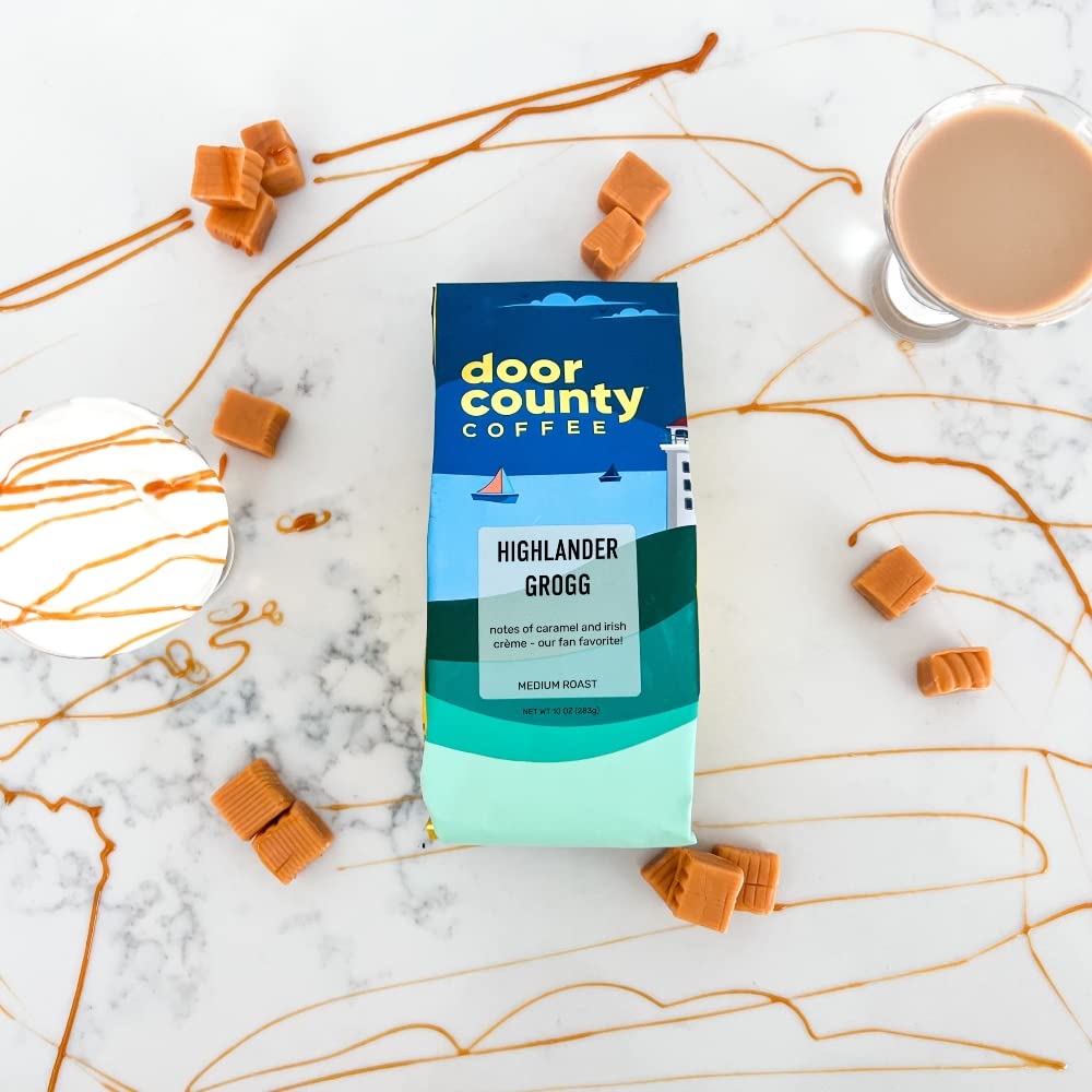 Q: What flavors are in the Door County Coffee Highlander Grogg?A: The Door County Coffee Highlander Grogg combines the rich flavors of Irish Crème and Caramel, creating a delightful and aromatic medium roast coffee experience.
