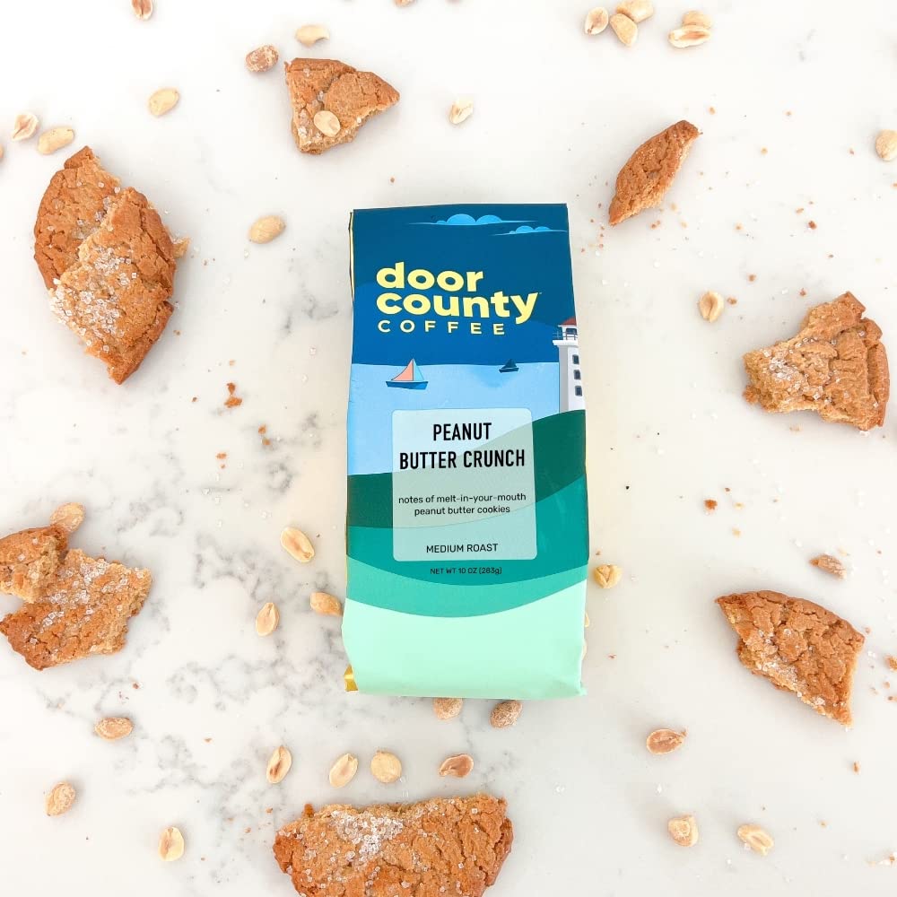 - Q: What is the flavor profile of Door County Coffee - Peanut Butter Crunch? A: Door County Coffee - Peanut Butter Crunch offers a creamy cup of medium roast coffee with rich notes of peanut butter. The flavor is smooth and low in acidity, leaving a delightful peanut butter infused finish that appeals to coffee lovers.