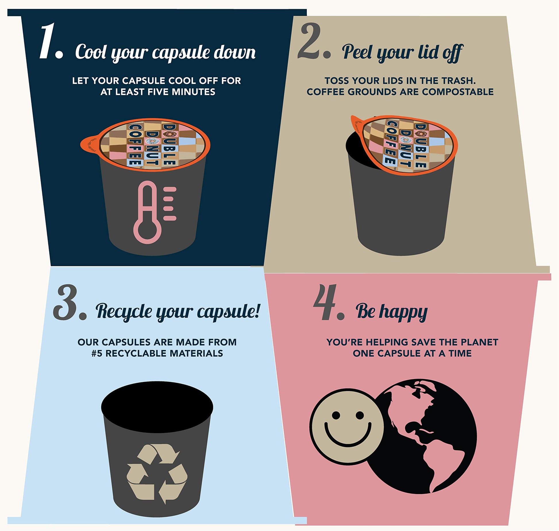 - Q: Are the coffee pods environmentally friendly? A: Yes, all Double Donut flavored coffee pods are made from 100% recyclable materials. Enjoy your caramel macchiato while knowing that you're making an eco-friendly choice.