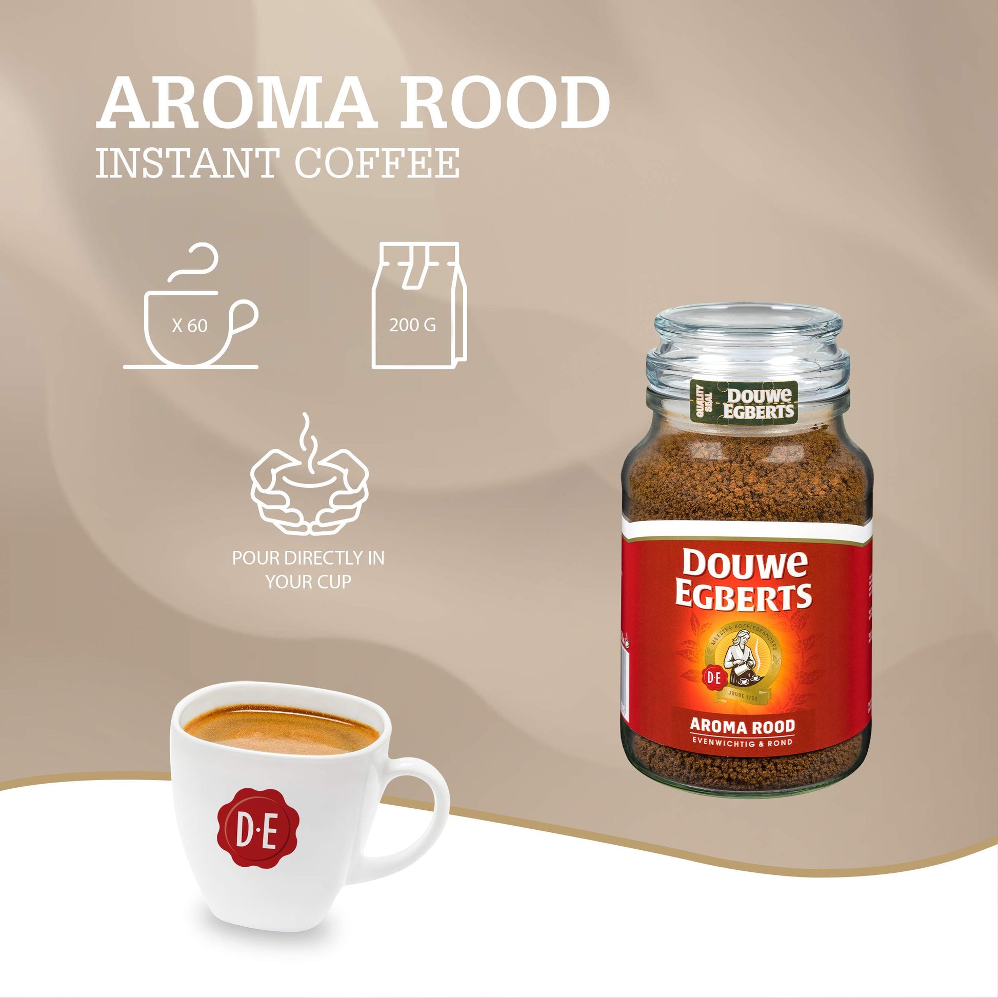 • Q: What makes Douwe Egberts Aroma Rood Instant Coffee unique? A: Douwe Egberts Aroma Rood Instant Coffee is known for its aromatic, smooth, and rich flavor profile, achieved through a careful blend of strong Robusta and aromatic Arabica beans. Its special sweetness allows many to enjoy it without added milk or sugar.