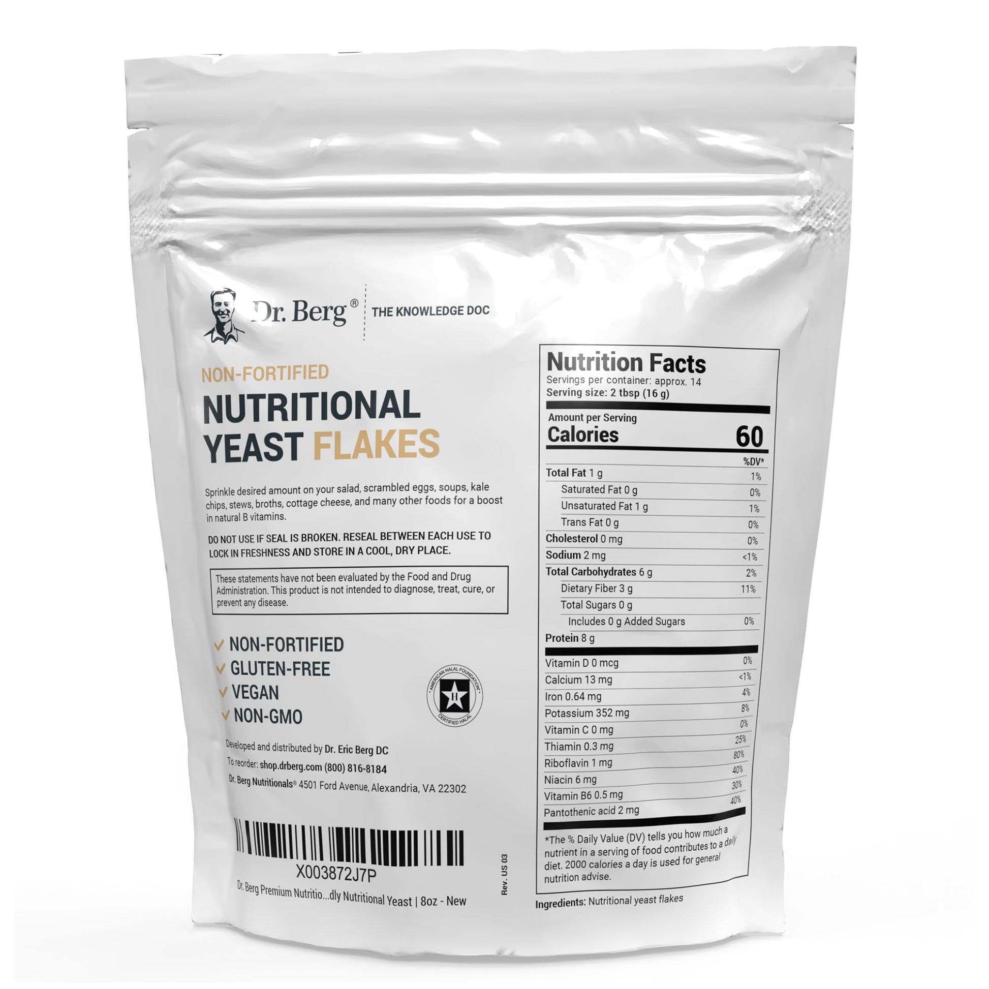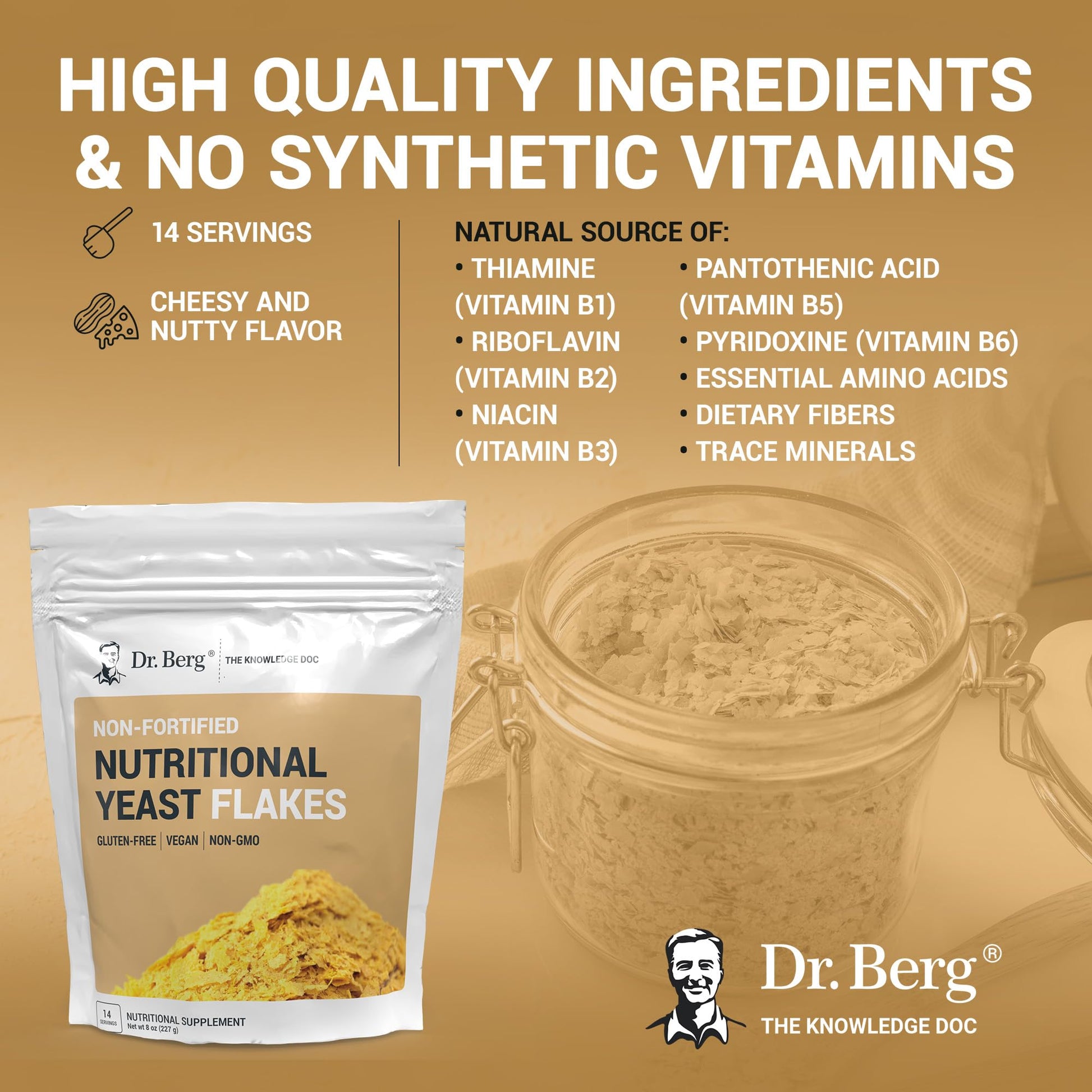 - Q: What are the health benefits of Dr. Berg's Nutritional Yeast Flakes? A: Dr. Berg's Nutritional Yeast Flakes are rich in B vitamins, which can help boost energy levels, support metabolism, and promote healthy hair, skin, and nails. They also contain essential trace minerals like zinc and selenium, which are important for immune function and overall health.